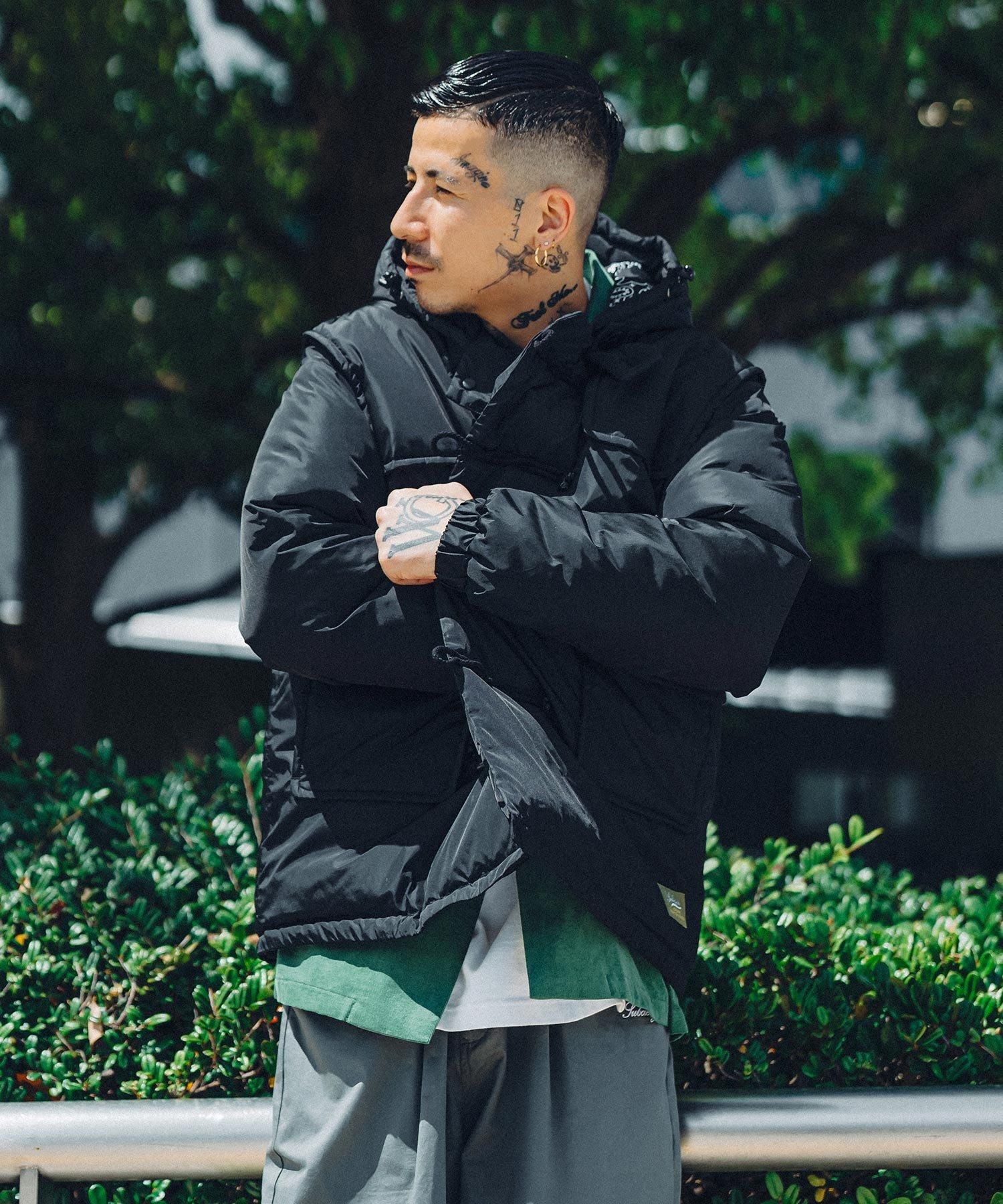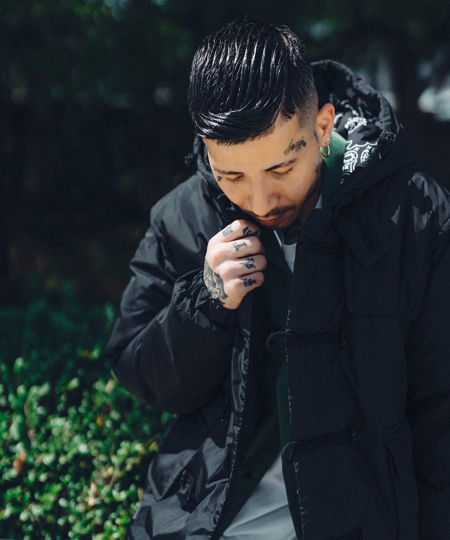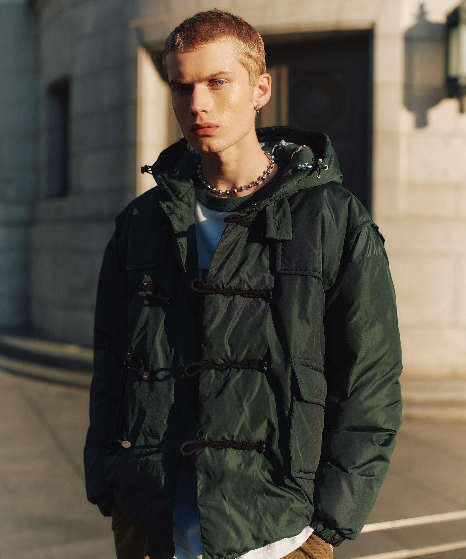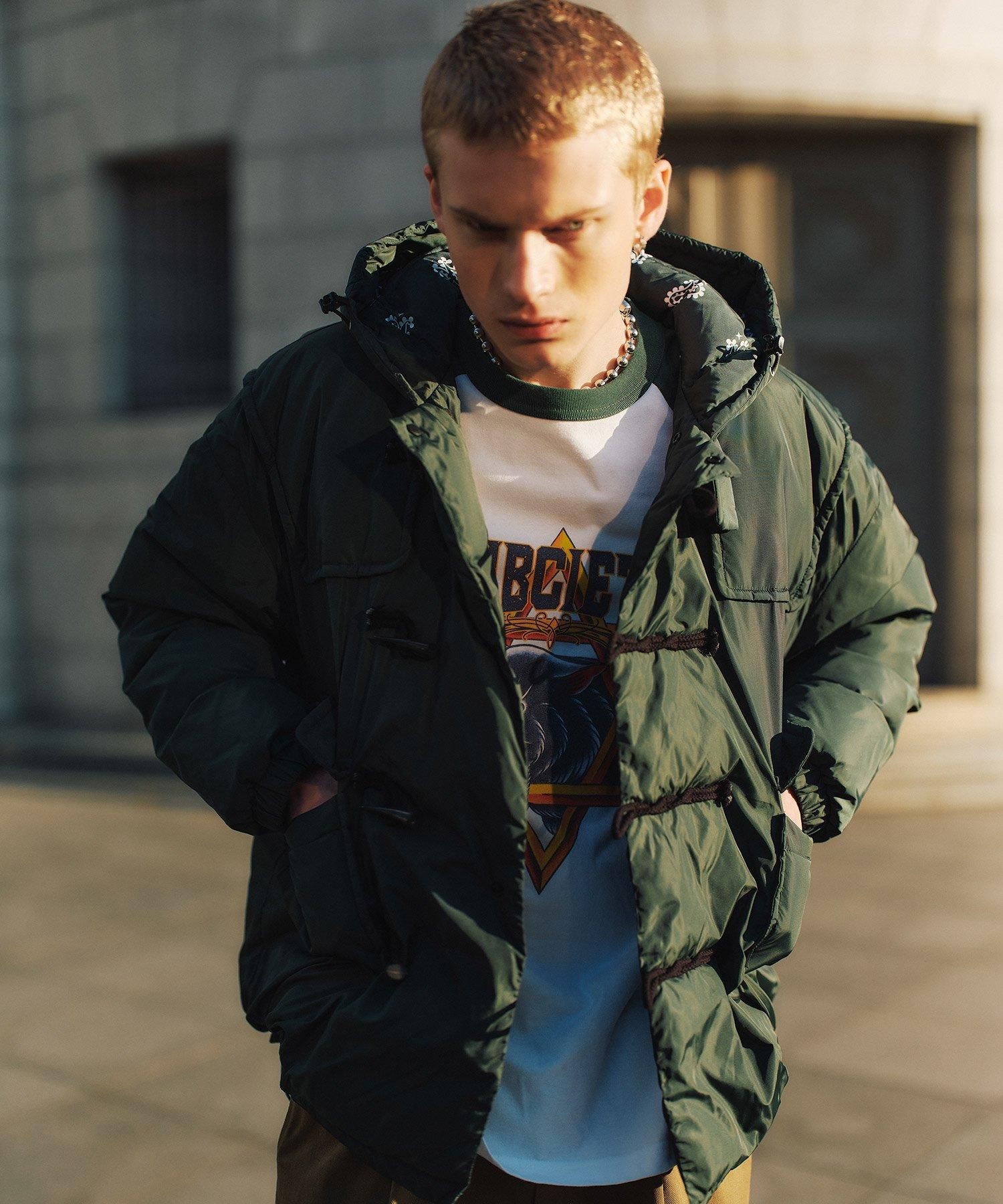 トグルは本水牛製の本格仕様。フードにはロゴ刺繍、裾にはブランドタグを配備。ドロップショルダーのオーバーサイズシルエットで伝統的なアイテムながらもストリートの雰囲気を纏う一着。