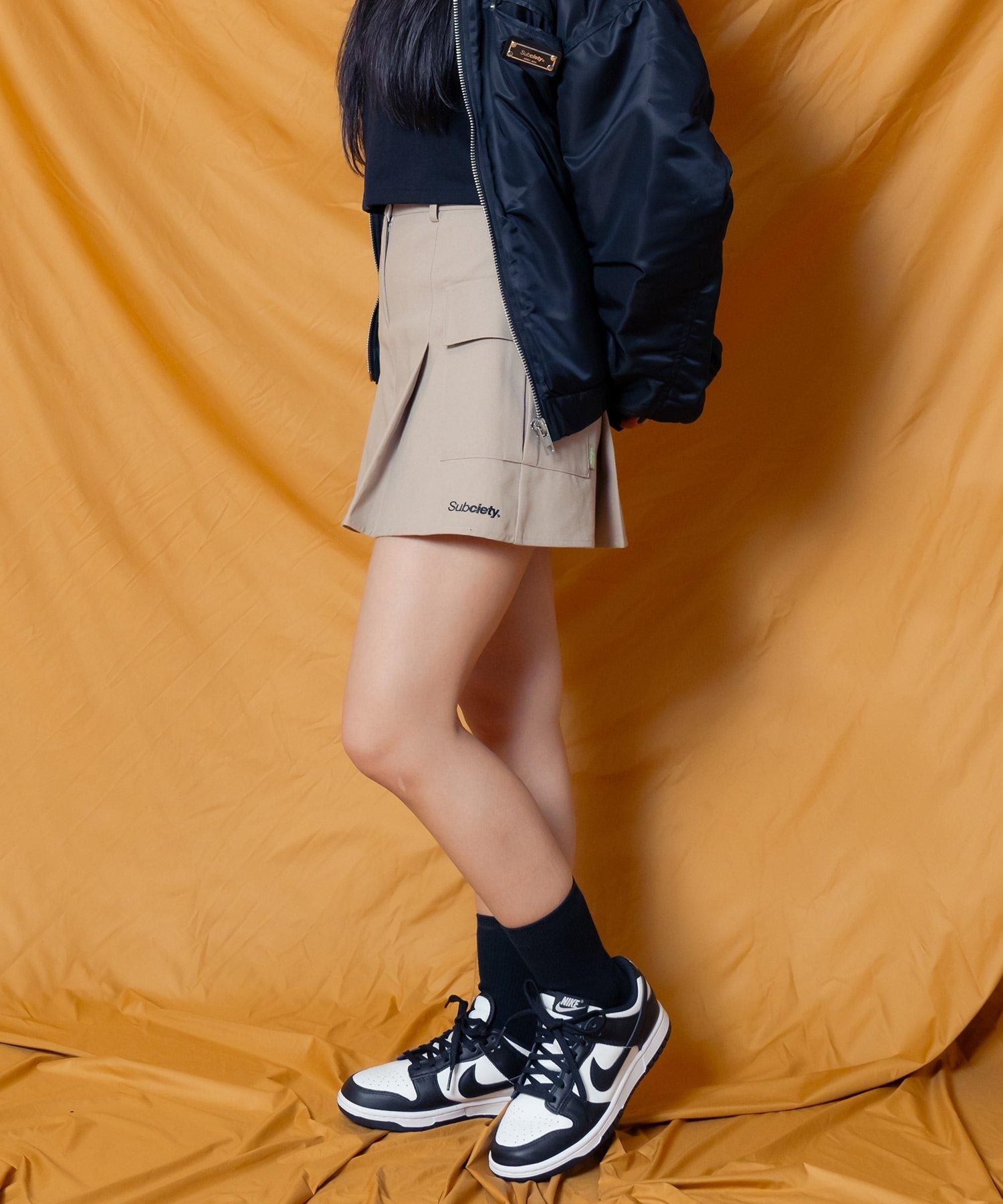 肉厚のコットンツイルを採用したミニスカート。サイドに大きなカーゴポケットを配備し、裾にはブランドのメインロゴ『THE BASE』を刺繍で施しました。左ポケットにはオリジナルのピスタグをオン。