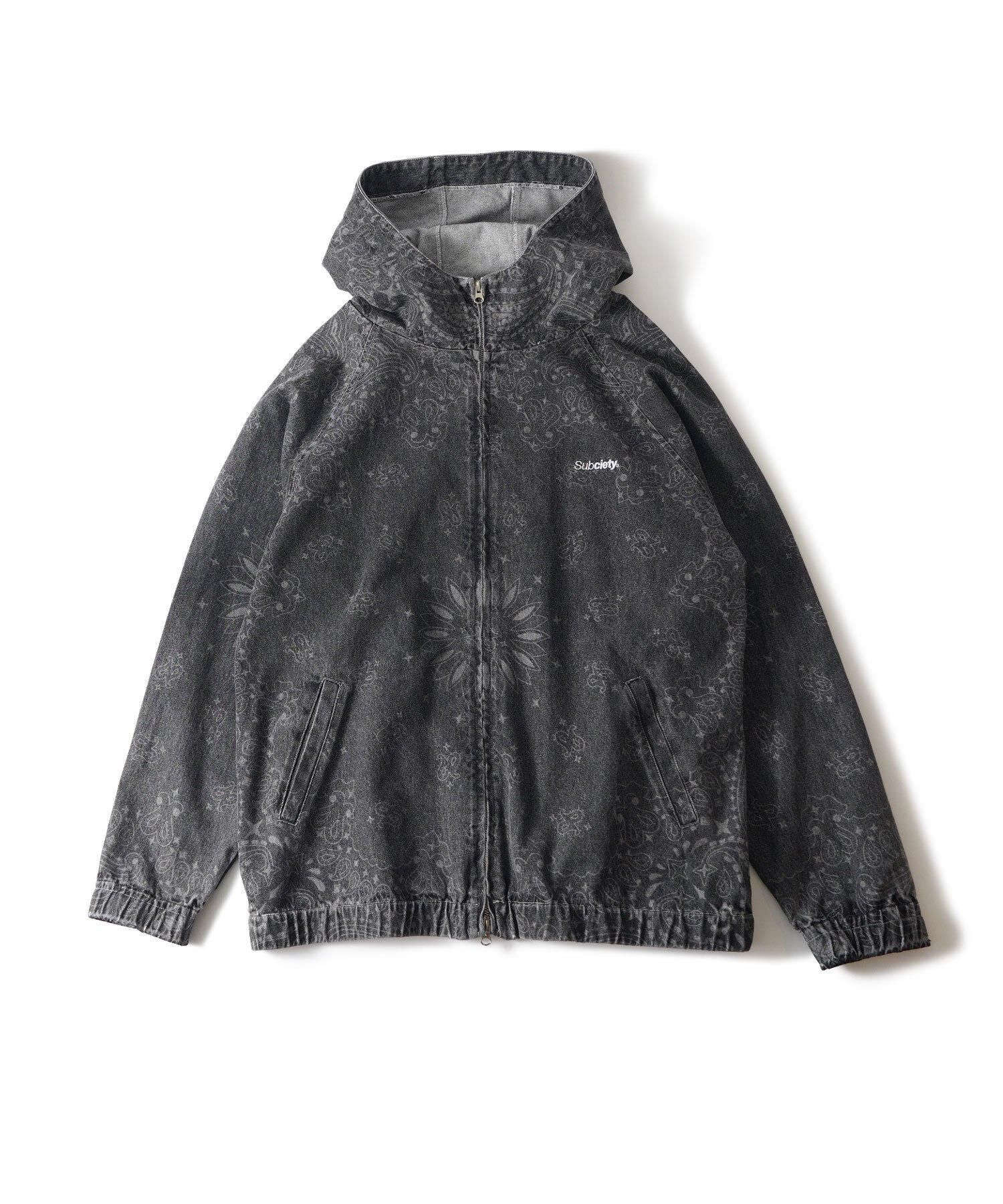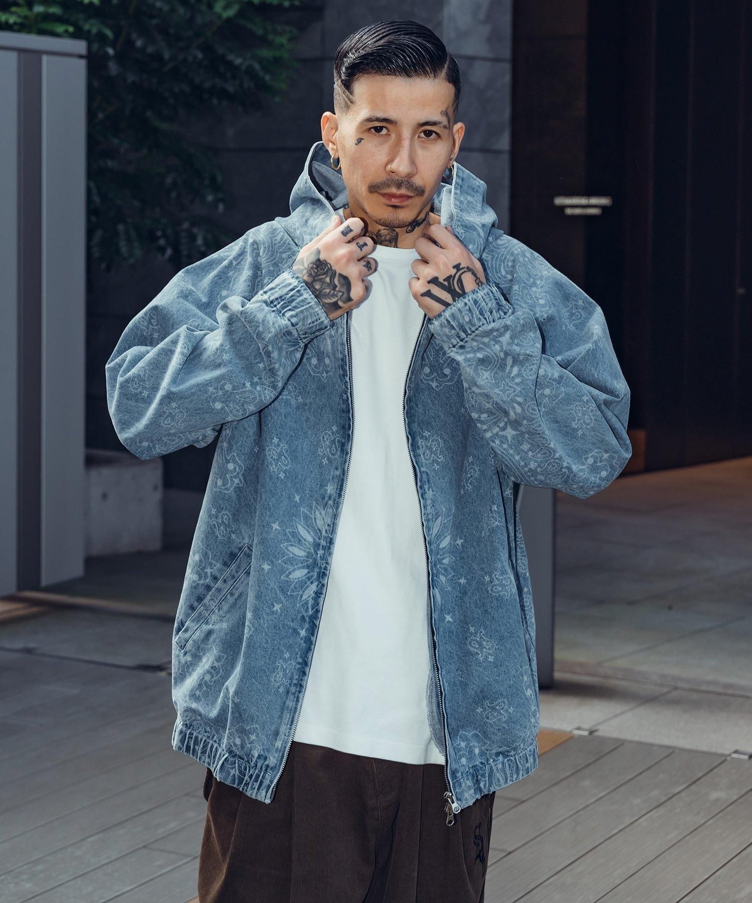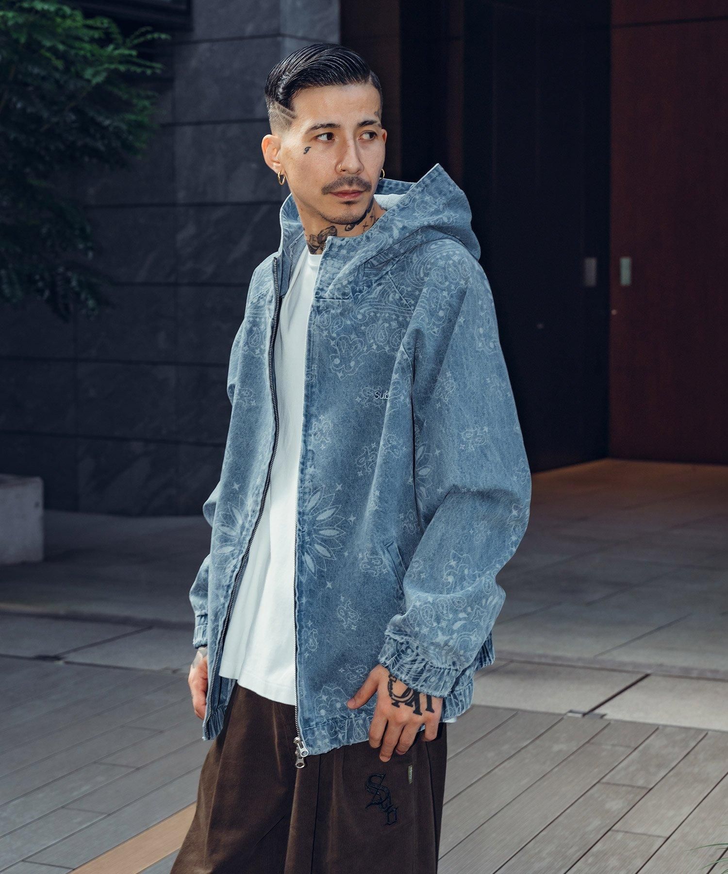左胸にはメインロゴ『THE BASE』を刺繍で施しました。全体にバンダナ柄をレーザー加工で施しました。フロントファスナーはダブルジップ仕様でシルエットを調節可能。春のストリートスタイルに役立つアイテム。
