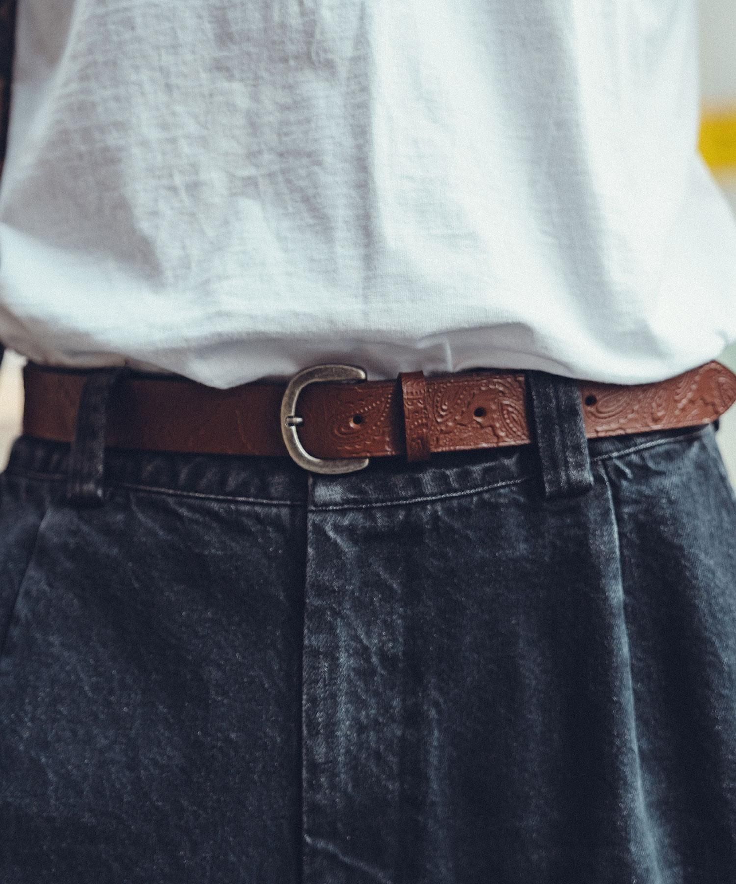 上質な牛革にブランドを象徴するペイズリーの型押しを施したレザーベルト。バックルはアンティーク加工の真鍮バックルを採用。小ぶりで武骨なバックルがポイント。裏側にはブランドロゴを銀箔プリントで型押ししています。