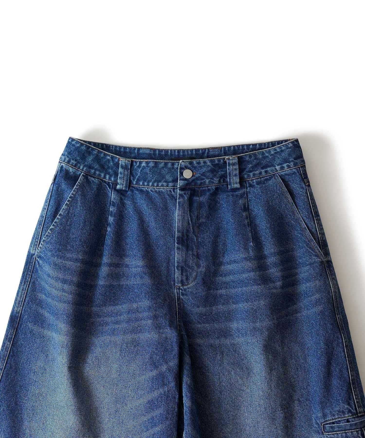 Aラインシルエットのデニムバミューダパンツ。12オンスのデニム生地を採用。ストーンウォッシュ加工を施し、全体にアタリを付け、ヒゲ加工もオン。ヴィンテージの風合いをイメージ。