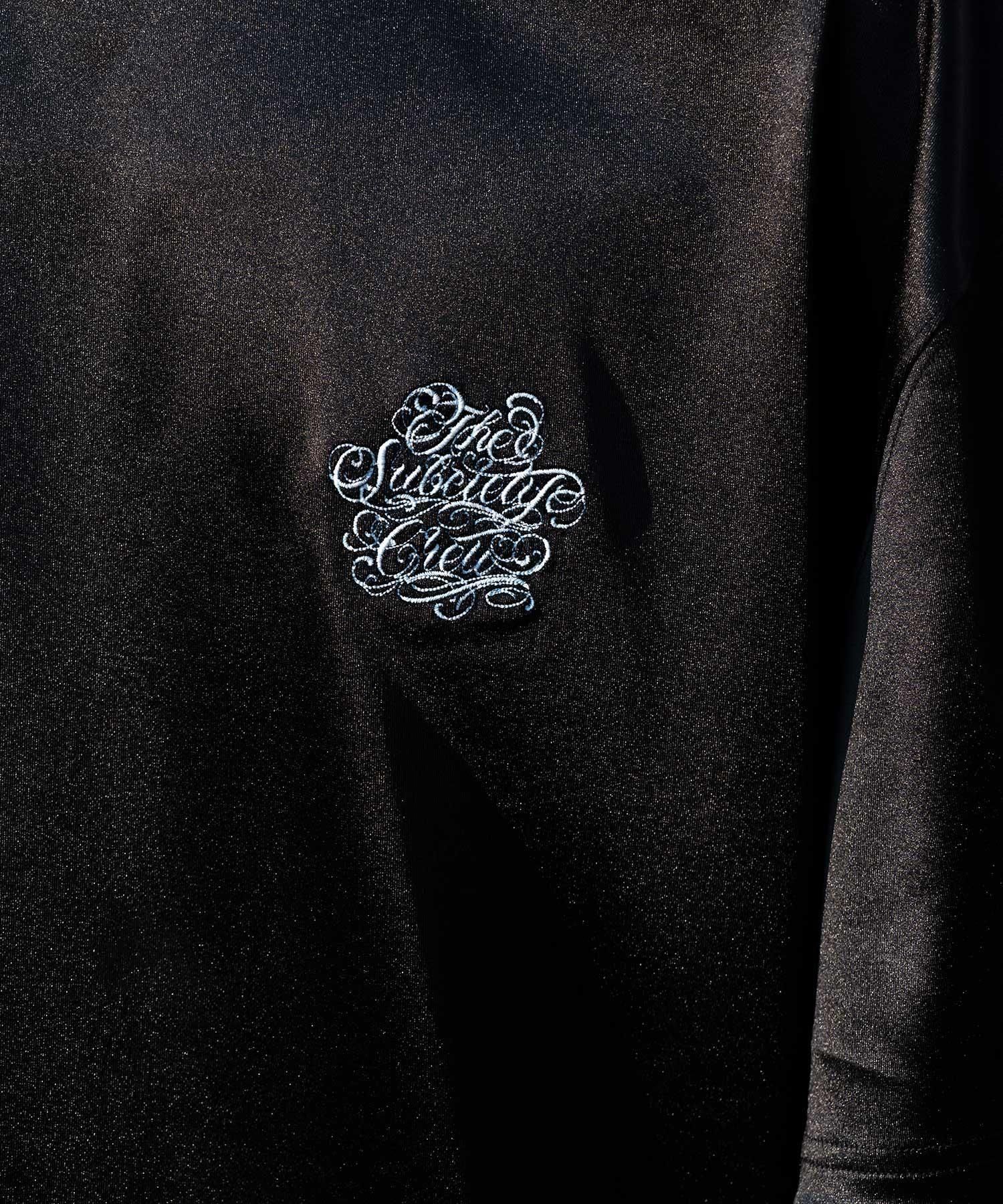8.4オンスの光沢のあるサテン生地で仕立てたドロップショルダーTシャツ。左胸には西海岸を彷彿とさせるピンストライプグラフィックを刺繍で施しました。