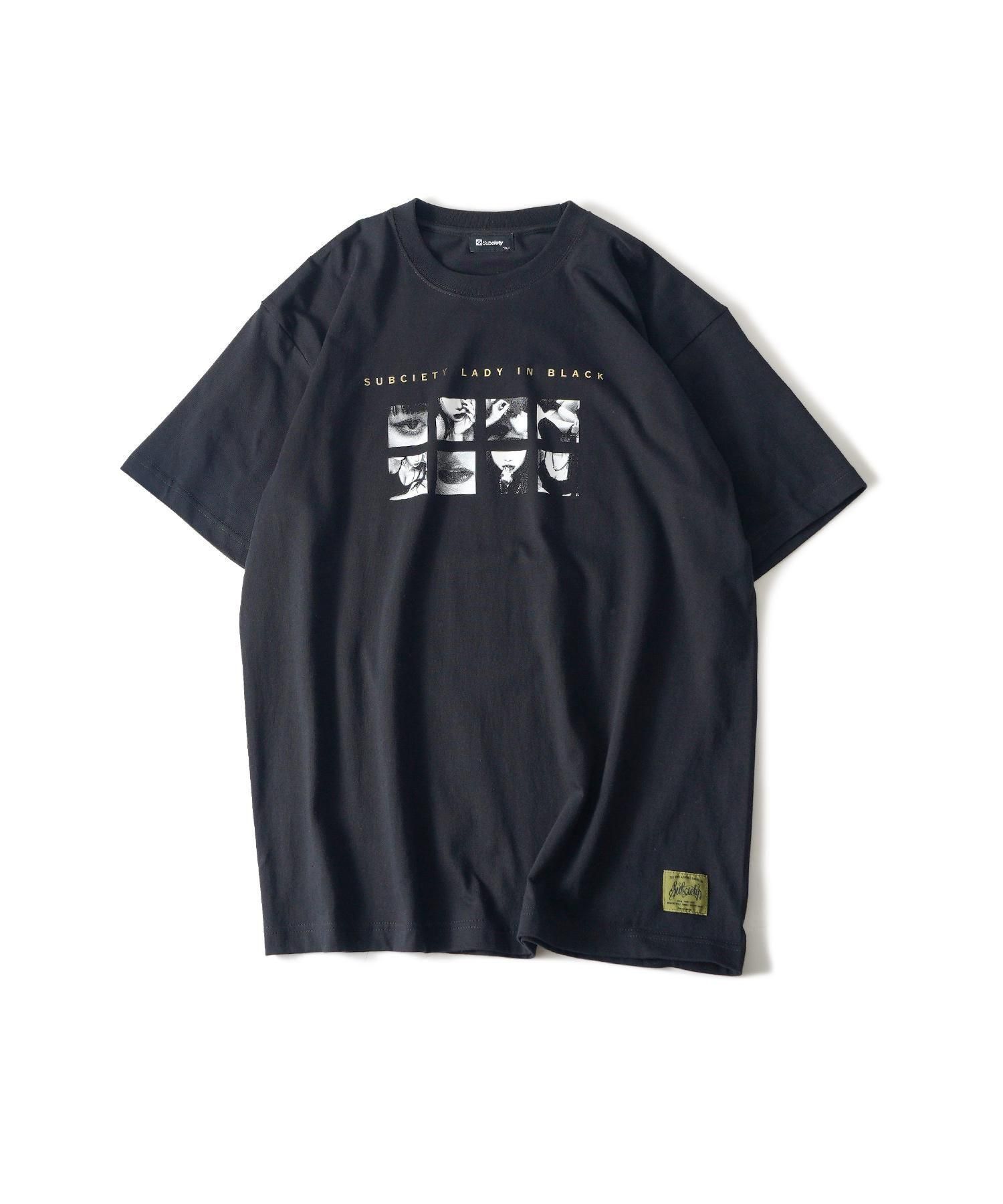 ブランドロゴとLady in blackのタイポグラフィを金箔プリントでオン。セクシーな黒髪の美女のフォトを並べてプリント。モノクロの網点で表現されたフォトが魅力の一枚。