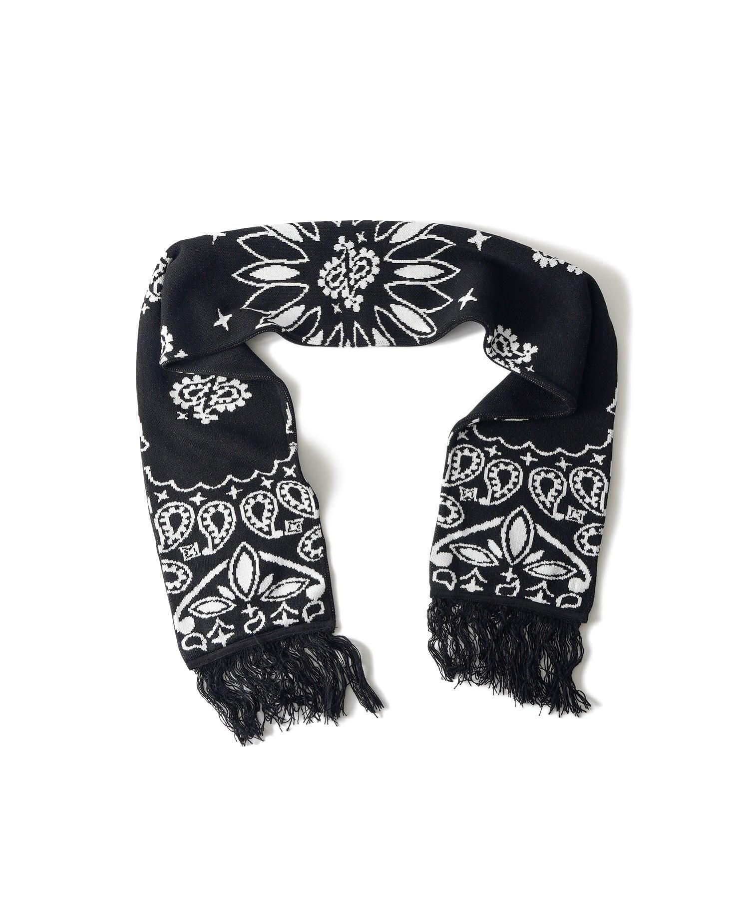 ブロークコアスタイルに欠かせないサッカーマフラー。二枚仕立てのボリュームが魅力。表面にはスポーティーなブランドロゴと架空のスポーツブランドロゴ、裏面にはバンダナ柄をジャガードで表現。