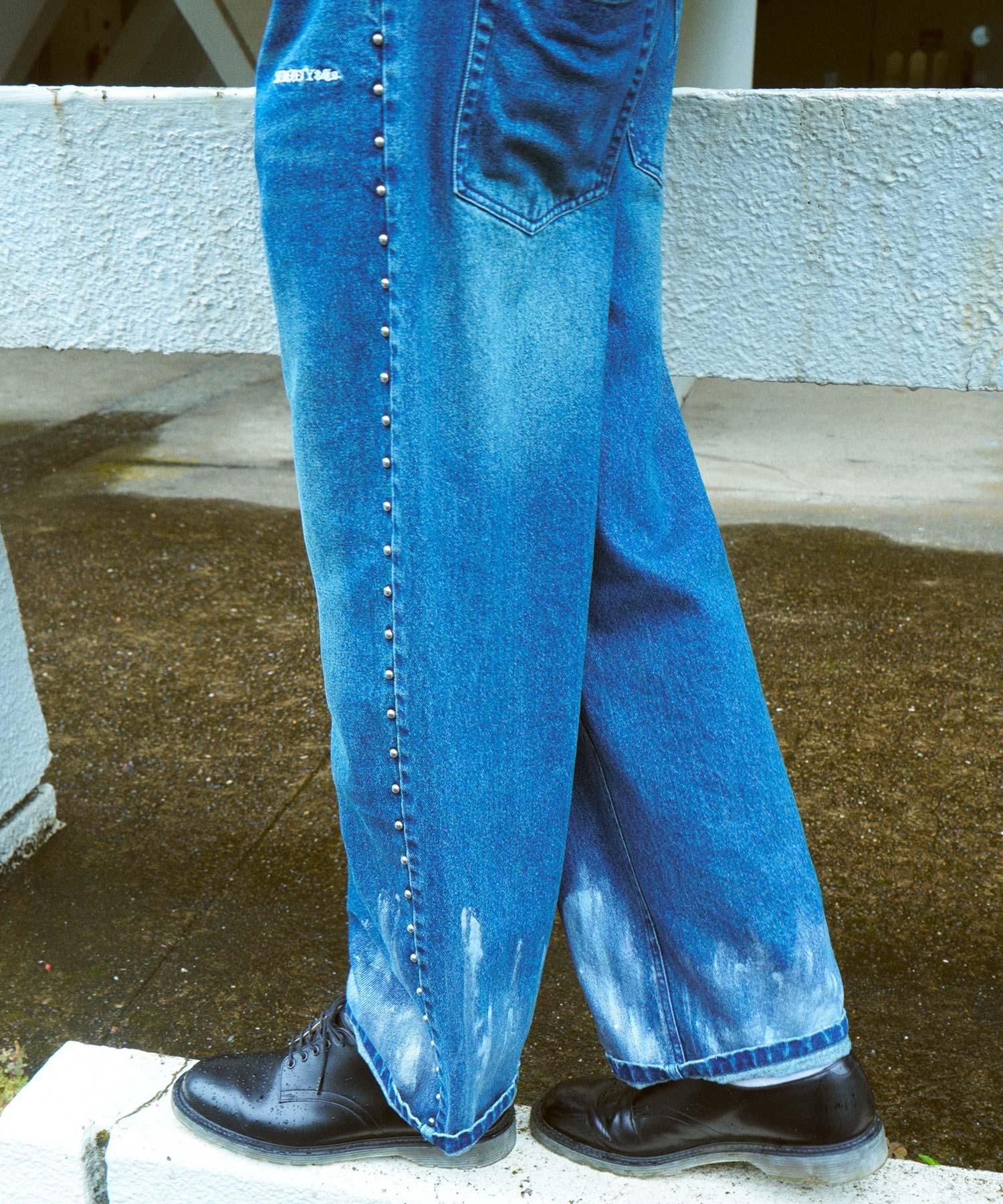 スタッズを打ち込みウエスタンやインダストリアルの雰囲気を漂わせるデニムパンツ。ヒップや腿回りにゆとりを持たせ、股下から裾先に向かって細くなるルーズテーパードに設計し、リラックス感がありつつもすっきりとした印象のシルエットに仕上げました。