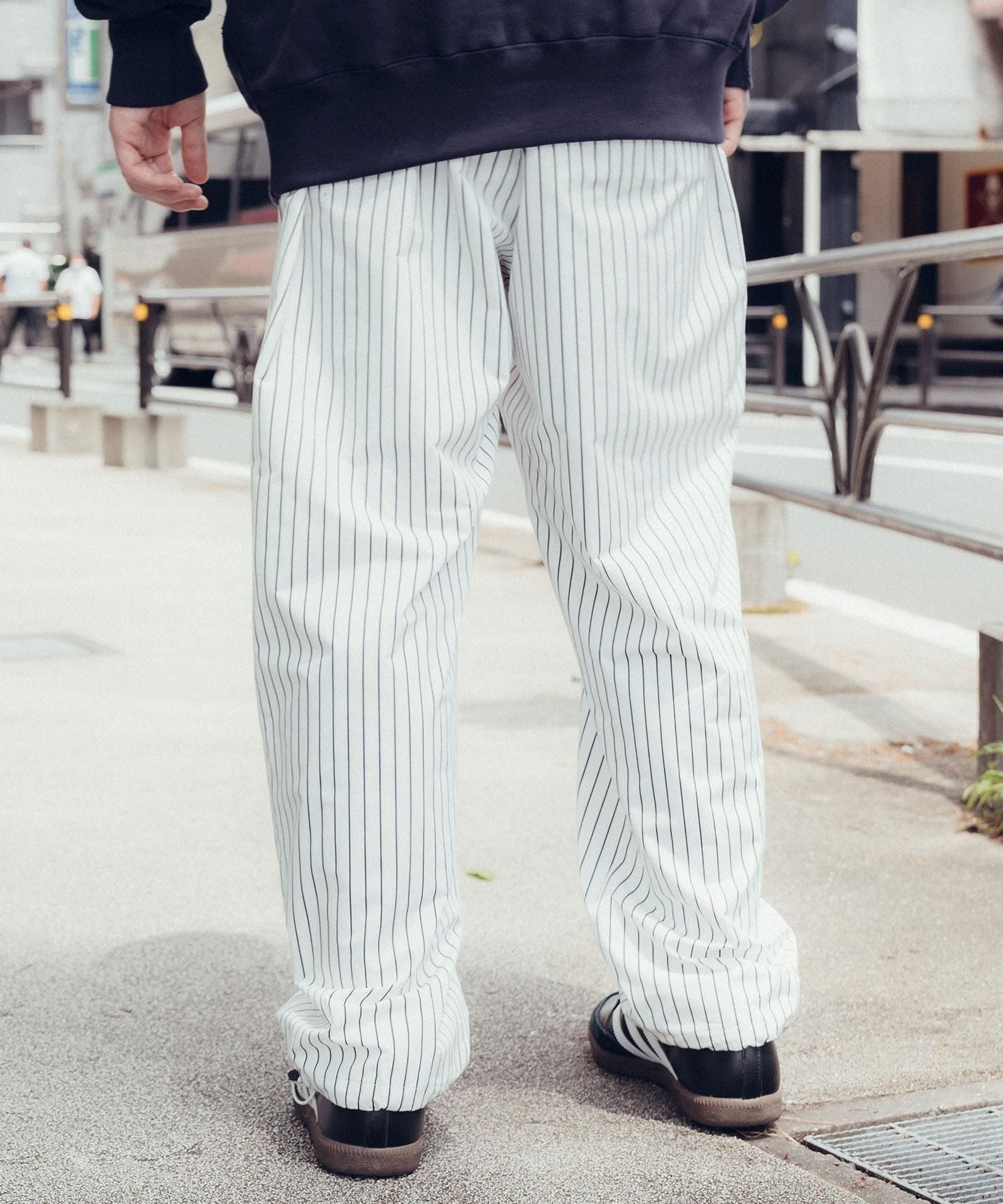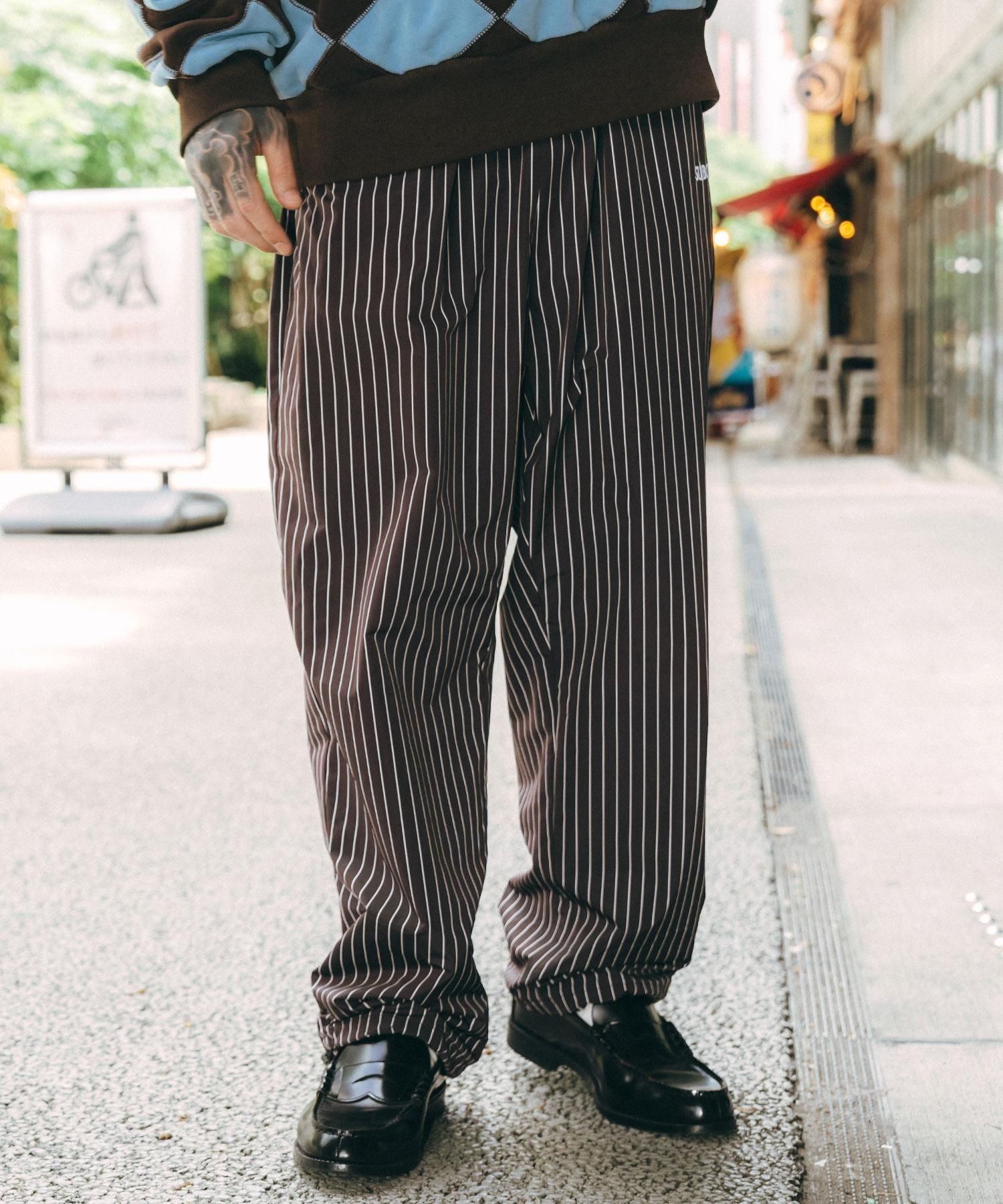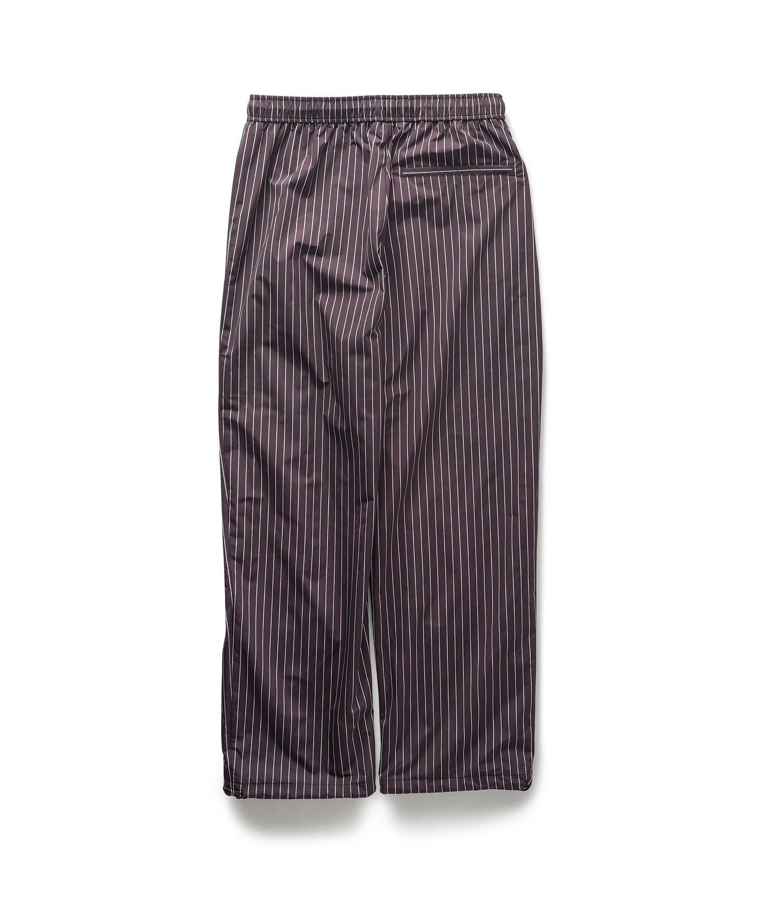 スポーティーなストライププリントのトレーニングパンツ。フロントにはブランドロゴを刺繍で施しました。ポケットはすべてファスナー付きで利便性を確保。裾はコードストッパー仕様でシルエットを調整可能。太めのわたりからの適度なテーパードシルエットが魅力の一着。