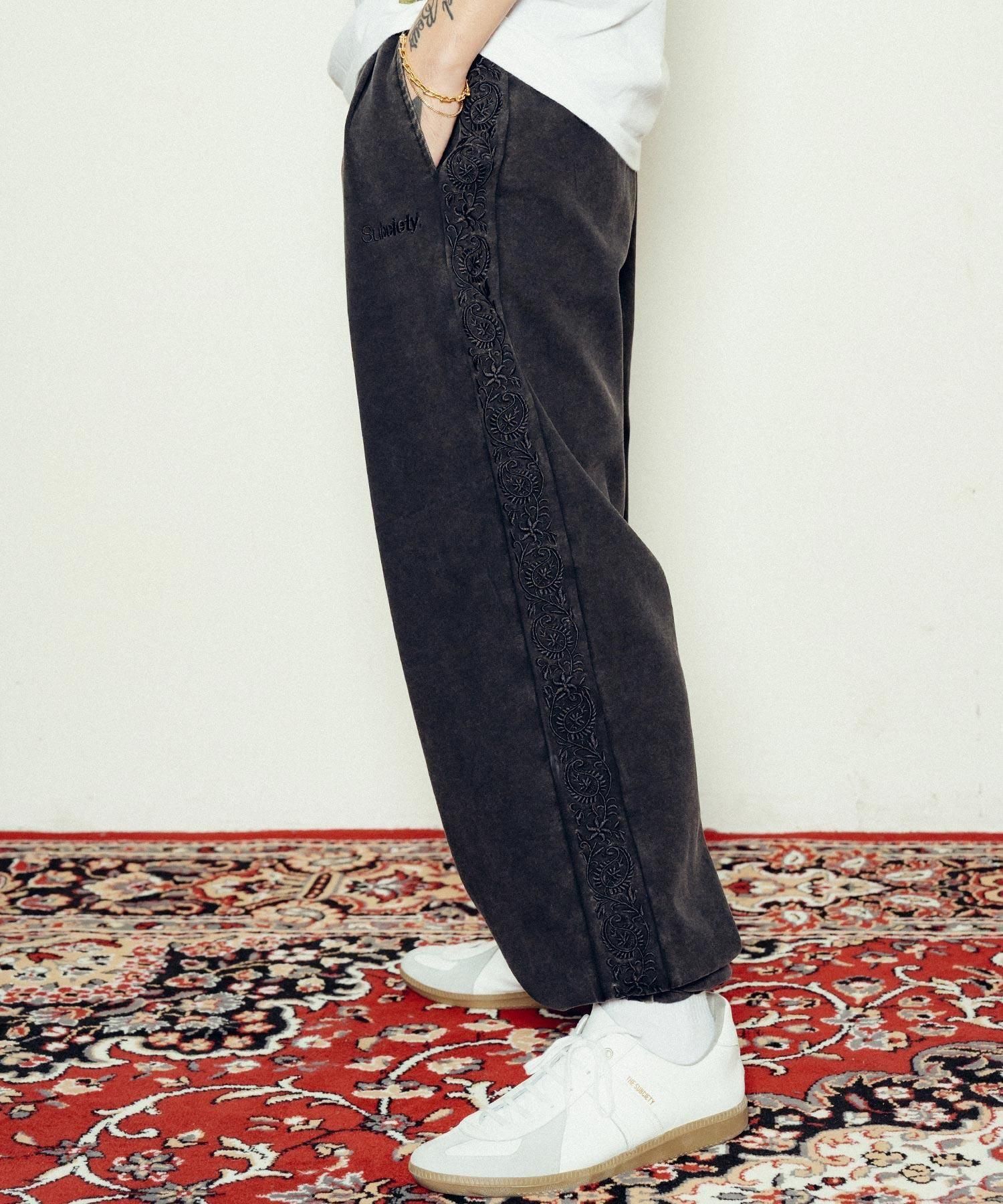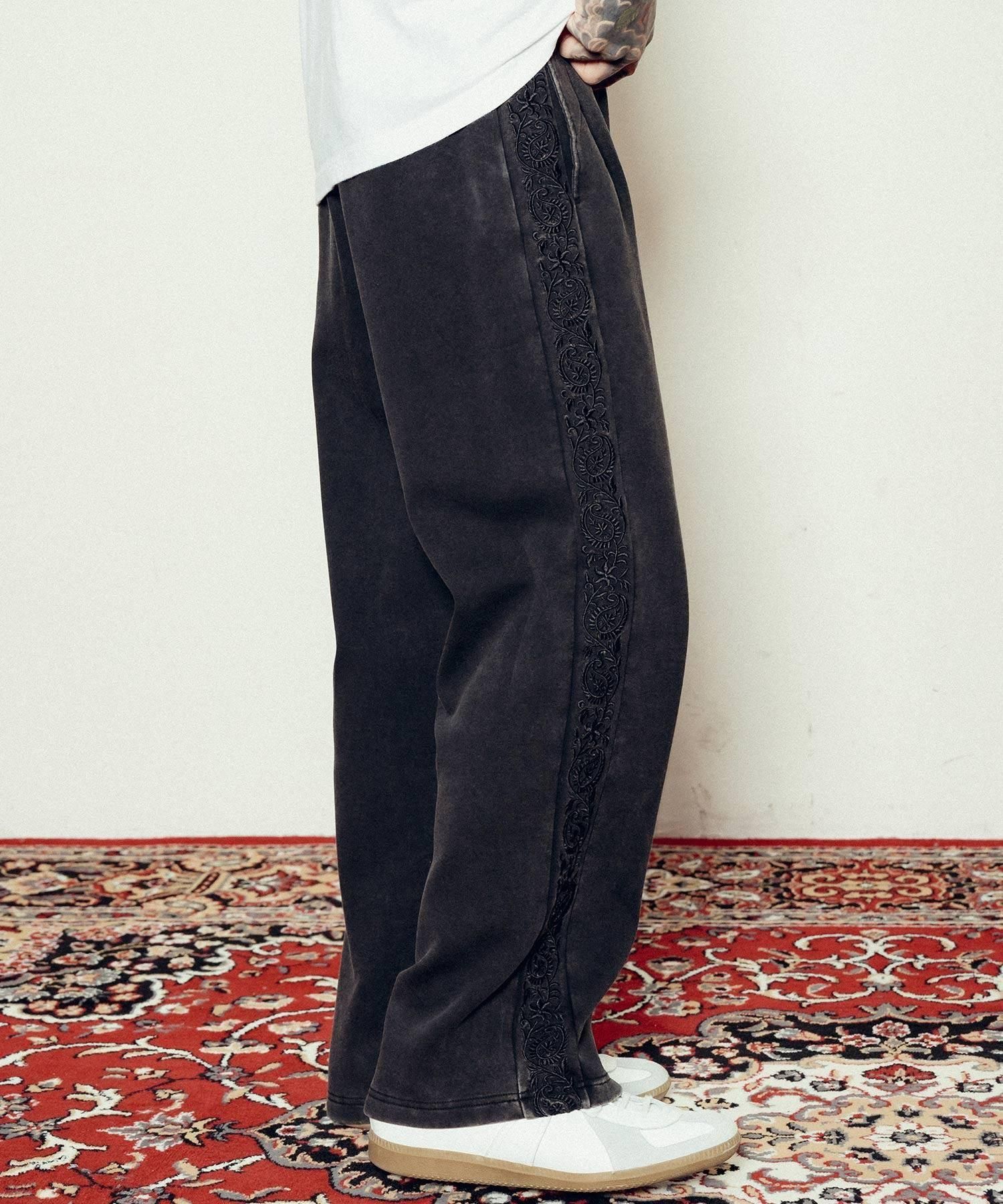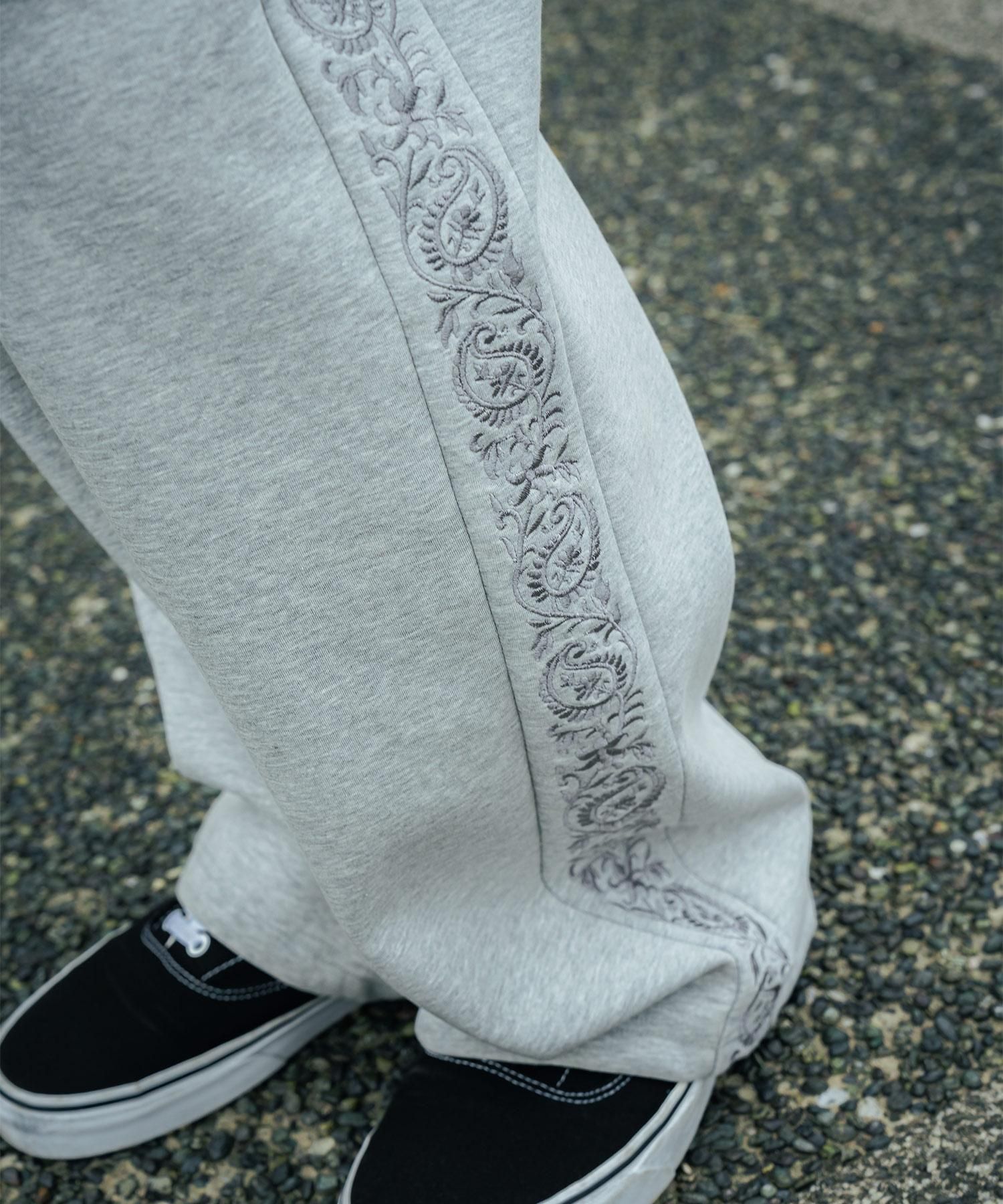 サイドにはペイズリー柄のラインパターンを大胆に刺繍でオン。左腿にはメインロゴ『THE BASE』を刺繍で施しました。