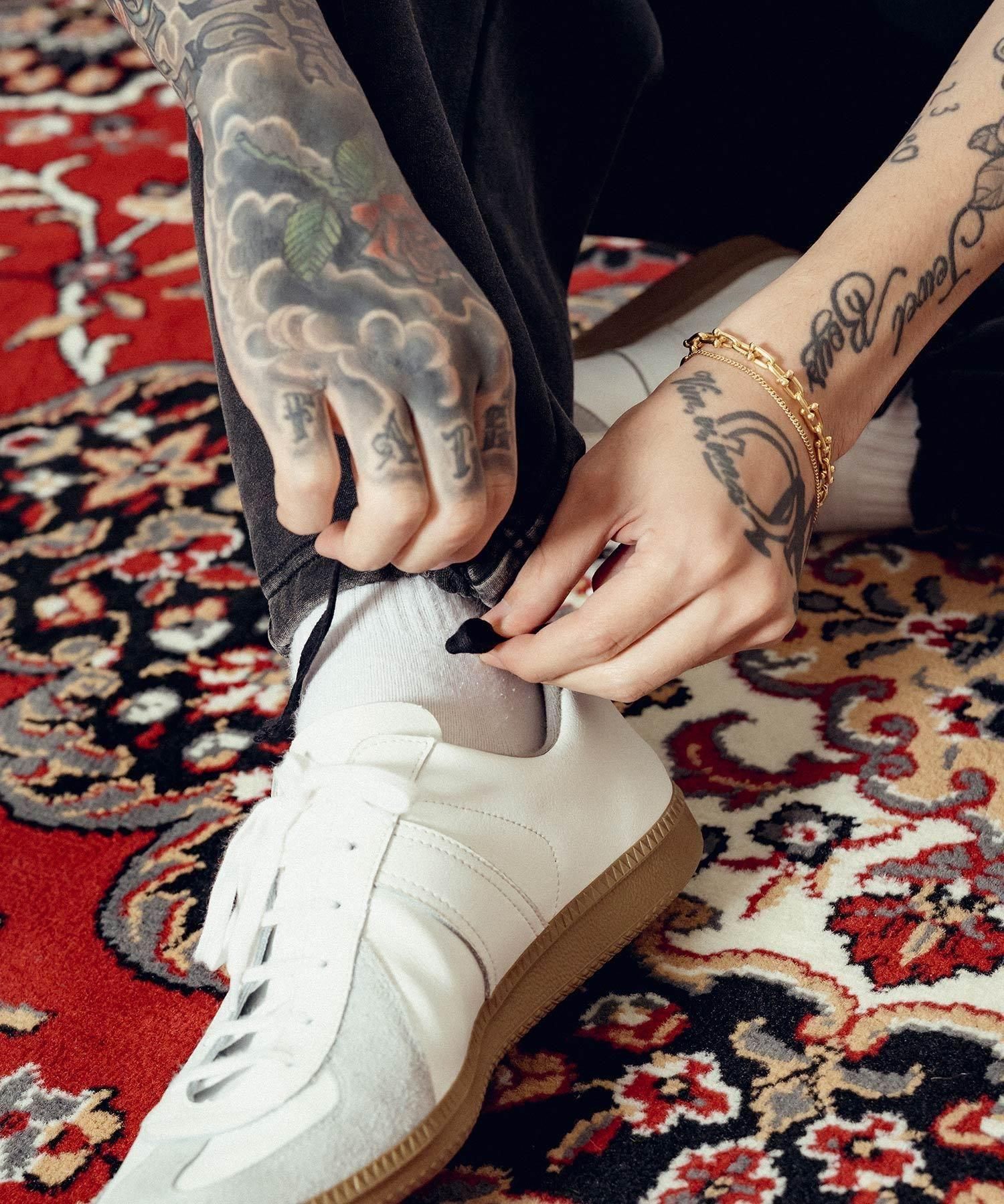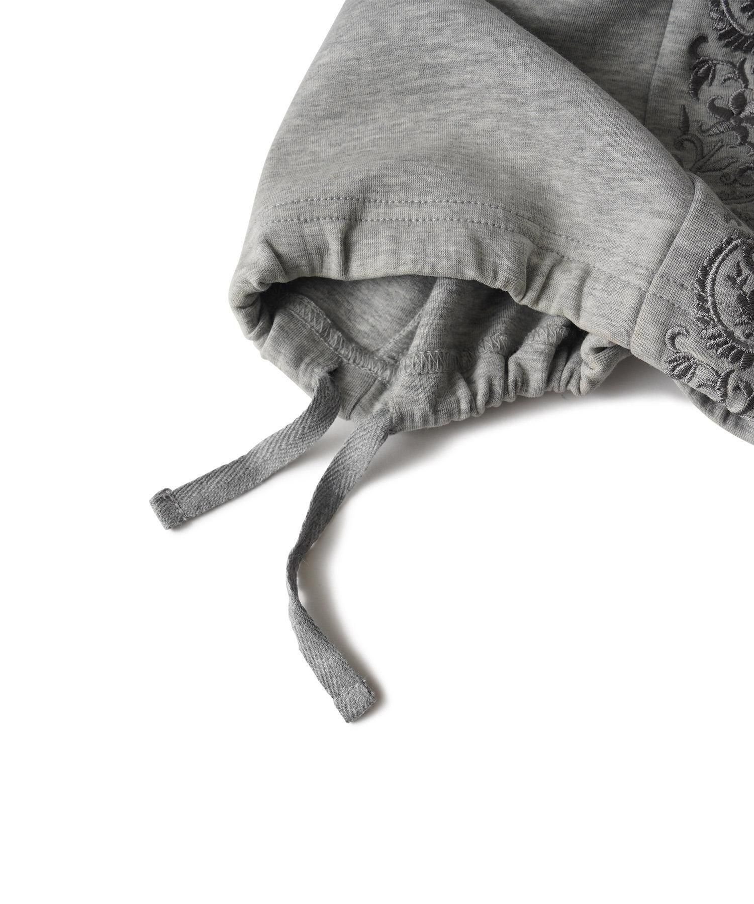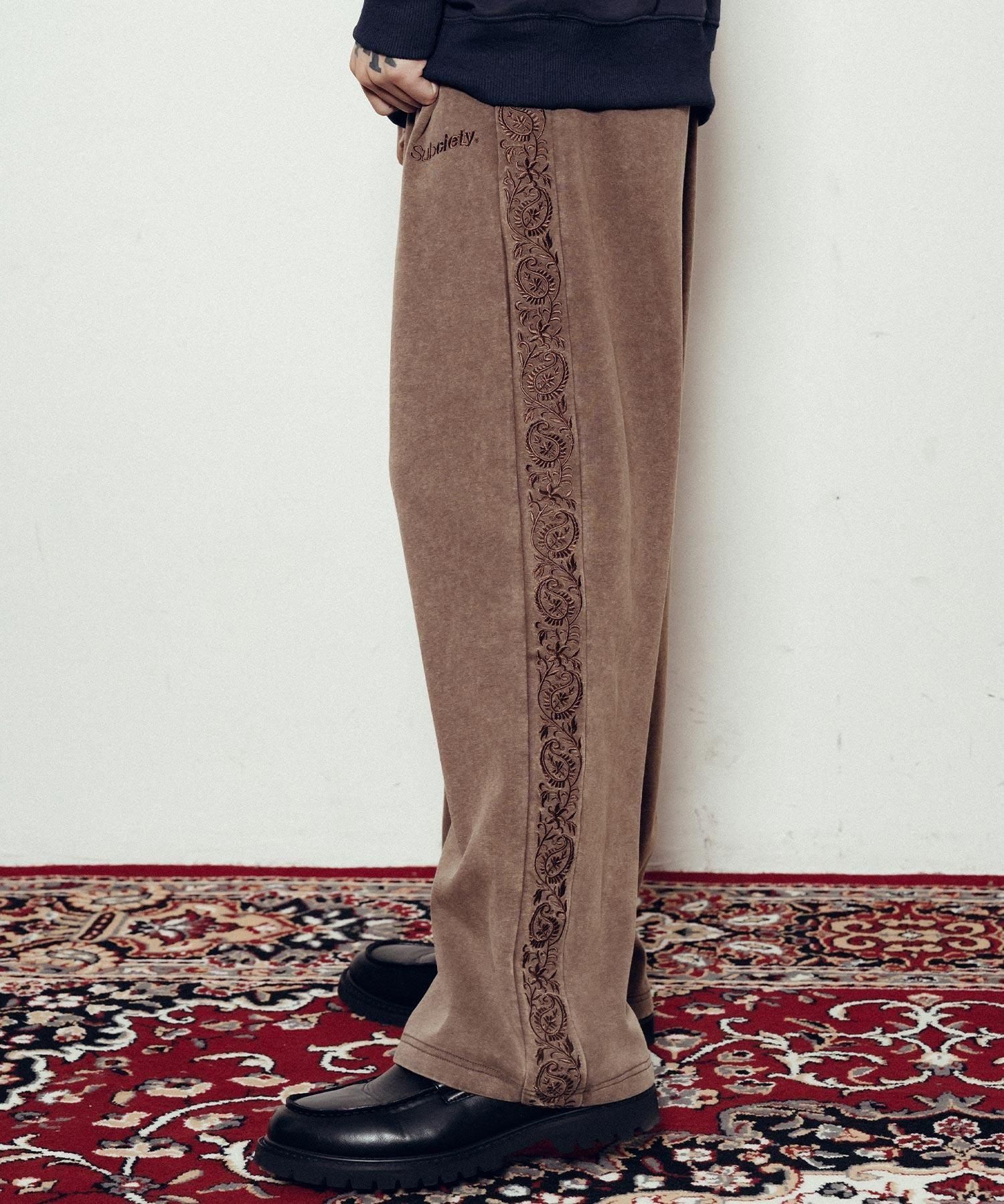 サイドにはペイズリー柄のラインパターンを大胆に刺繍でオン。左腿にはメインロゴ『THE BASE』を刺繍で施しました。