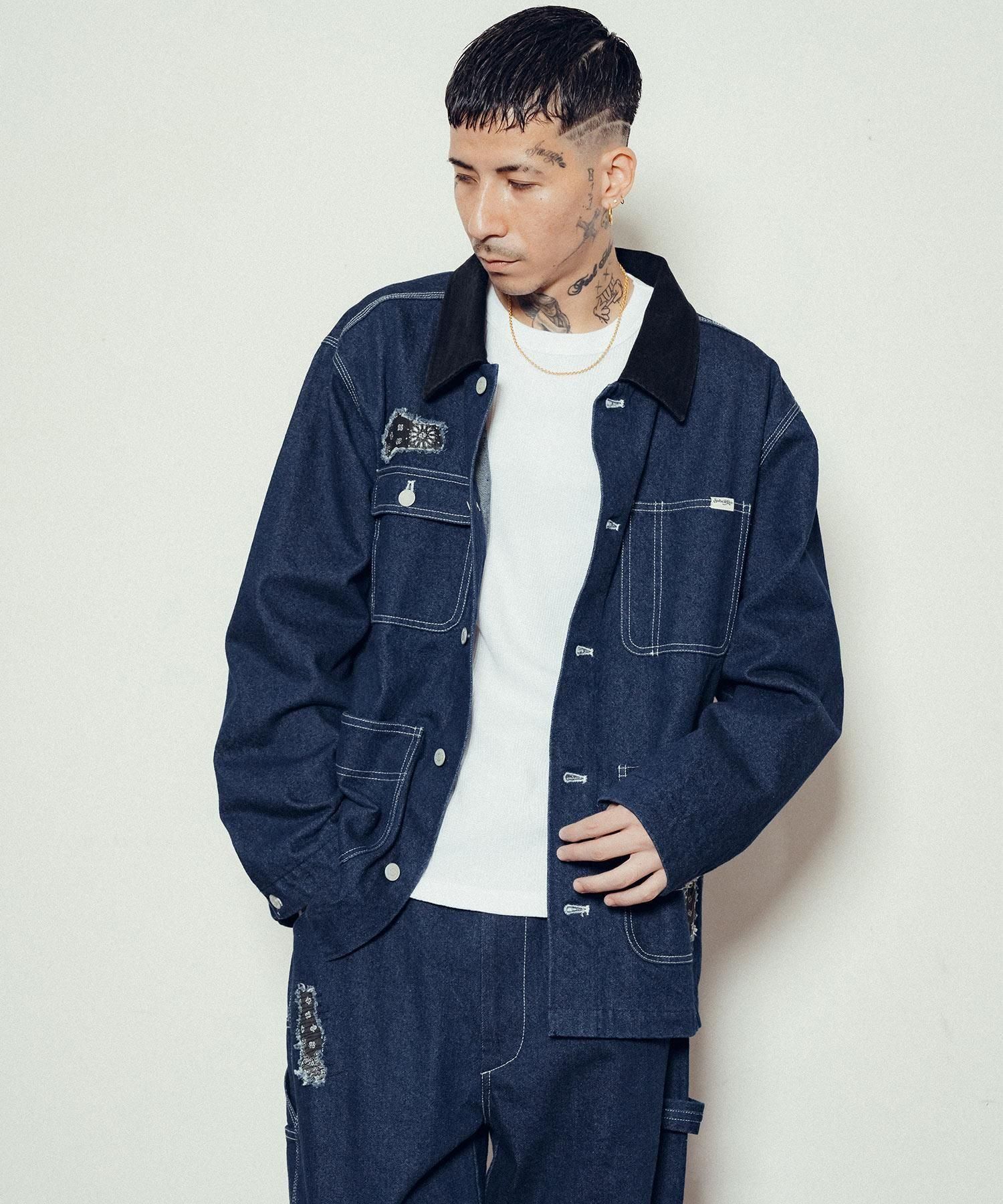 ブランド視点でモディファイしたカバーオール。本体に施したクラッシュ加工部分に、バンダナパターンをプリントしたツイル生地をジグザグステッチで叩き付けることでユーズドのような雰囲気を演出。