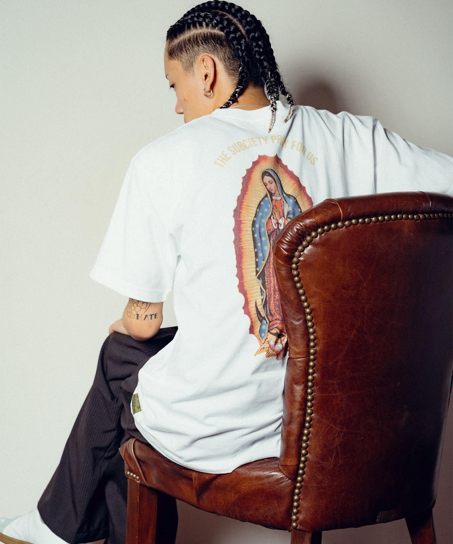ブランドが得意とするマリアグラフィックを左胸、バックにプリントで施しました。西海岸を彷彿とさせる雰囲気が特徴のアイテム。クラシカルな雰囲気のグラフィックが普段のスタイリングにアクセントを与えてます。