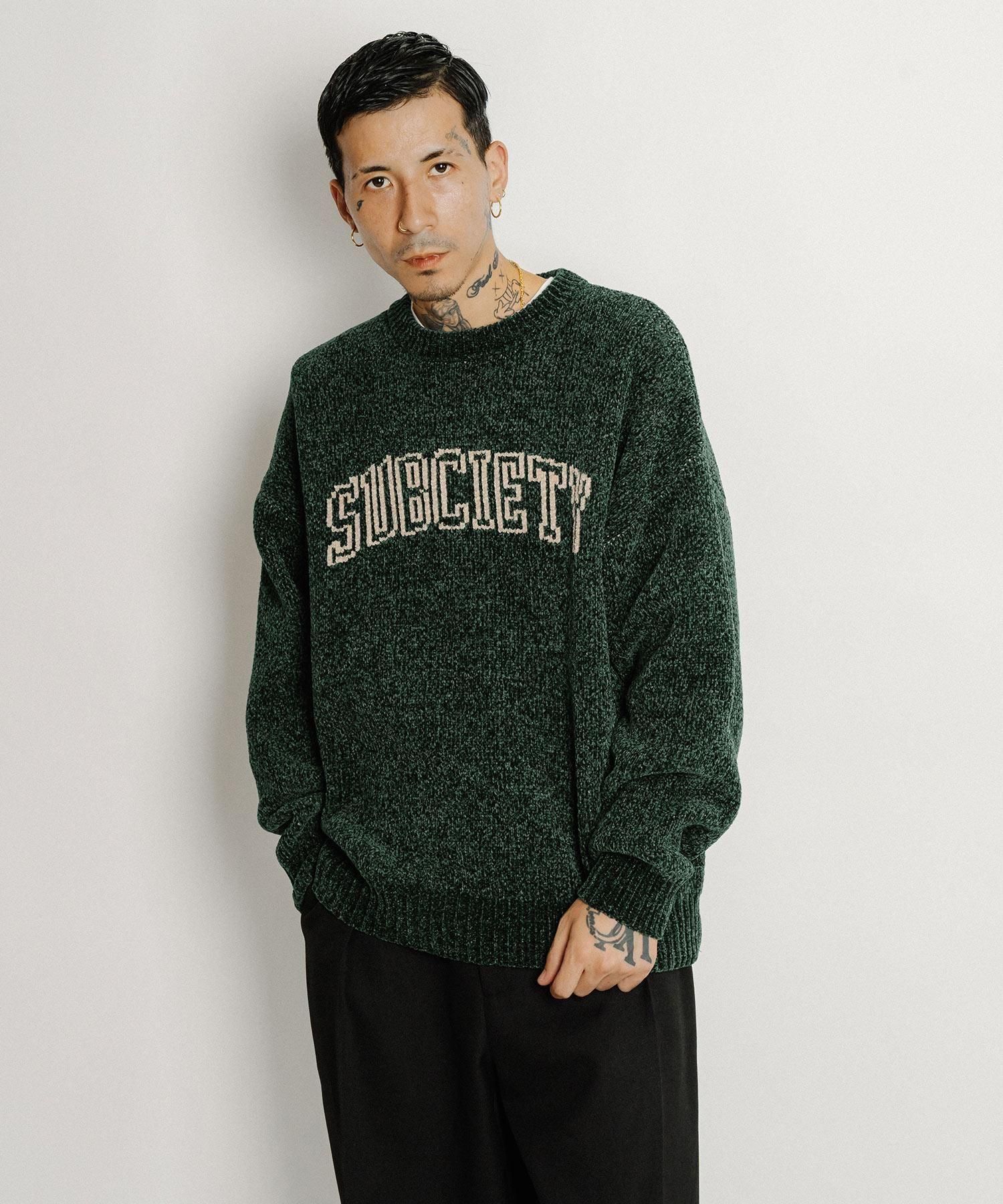 裾先は絞りを効かせ、丸みのある印象に。フロントにはカレッジロゴをイメージした「SUBCIETY」の文字をジャカードで表現。アクセントとして裾には織りタグを配備。