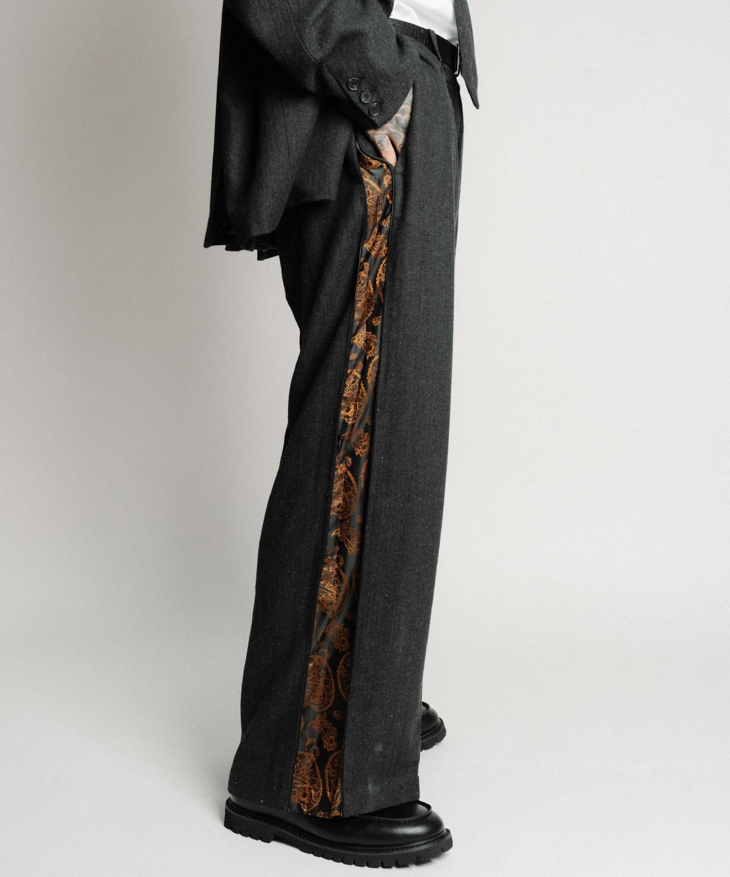 サイドジップを閉じるとスタンダードなツイードスラックス、開くと存在感のあるペイズリー柄ジャカード生地が出現し、2通りのデザイン/シルエットをお楽しみいただけます。