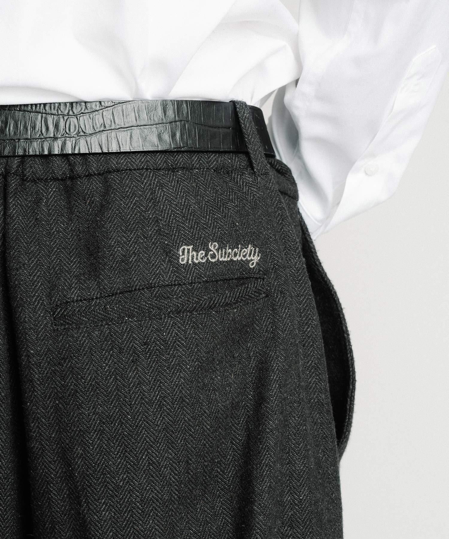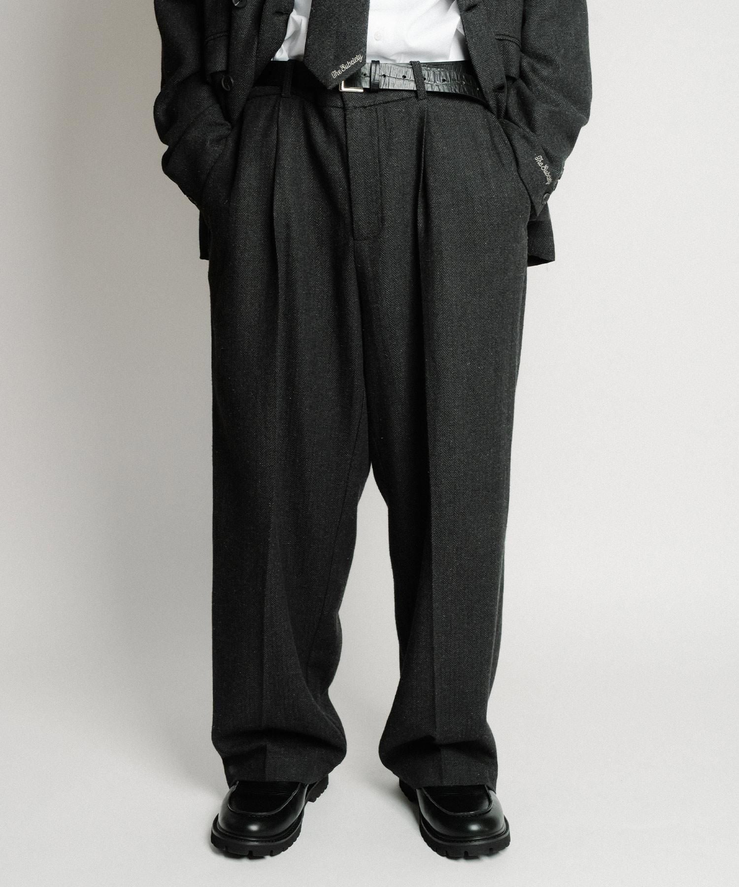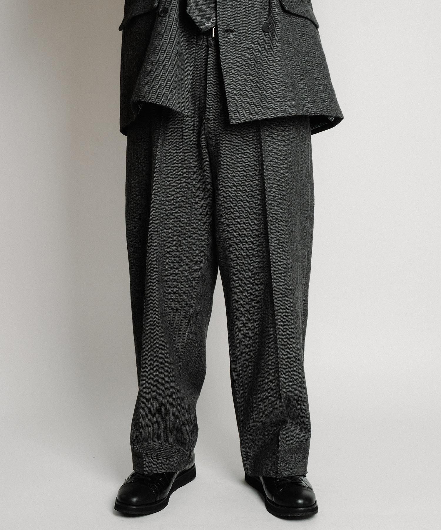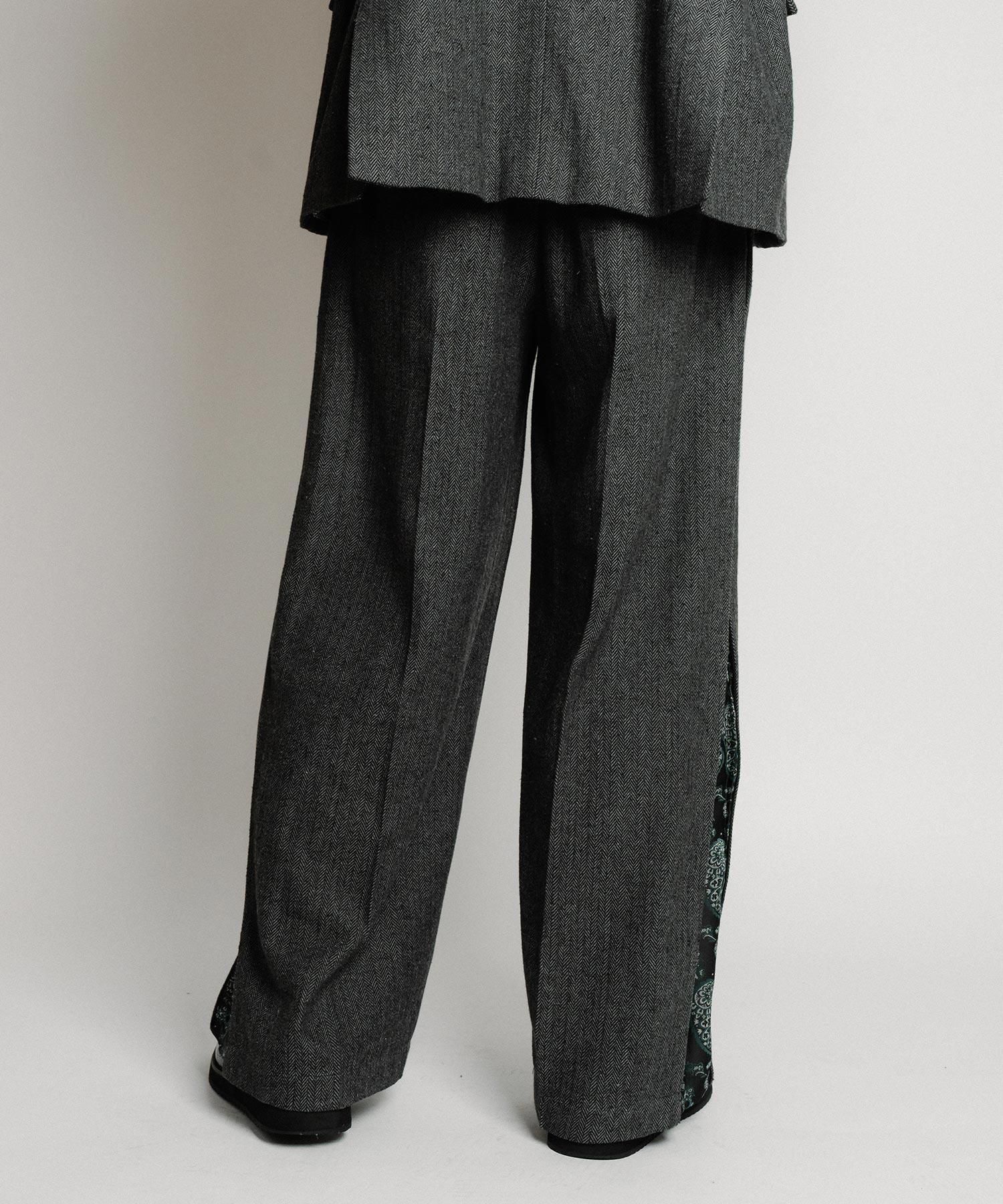2つの表情を併せ持つワイドスラックス。メイン生地は温かみと独特な表面感が魅力のヘリンボーン柄ツイード生地を採用。