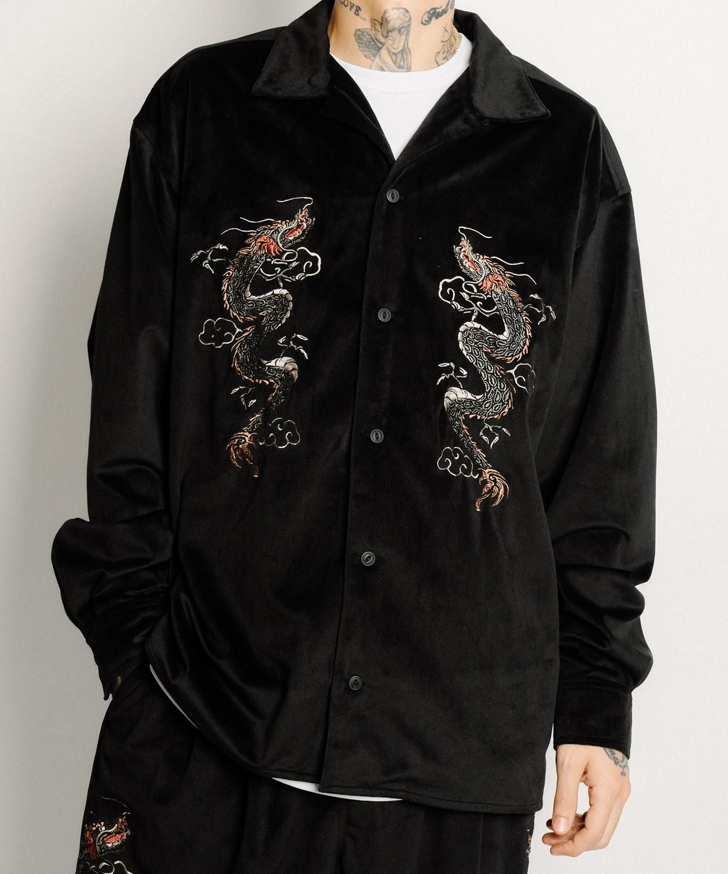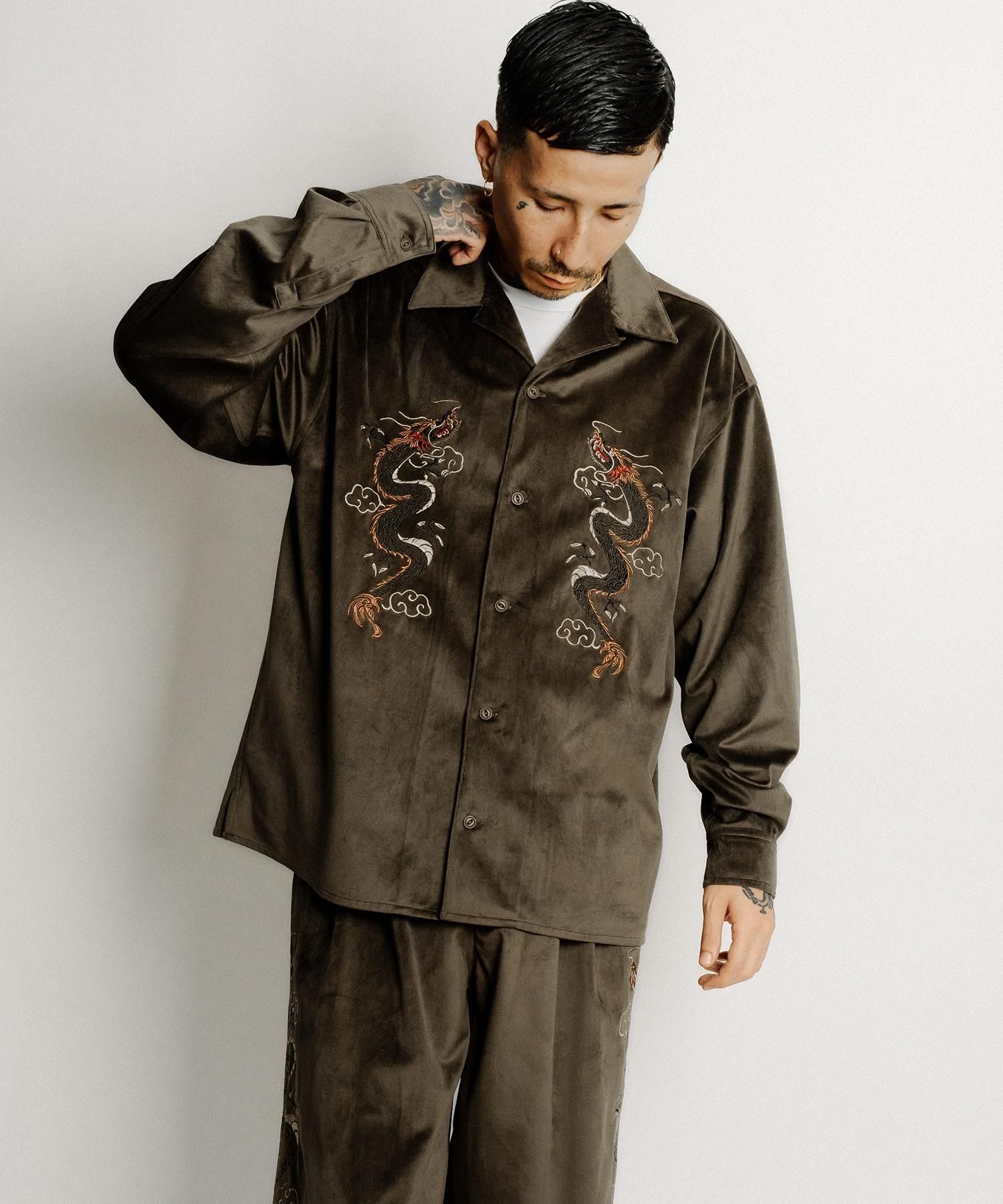 トラディショナルな開襟シャツのディティールを残しつつ、身幅・アームホールにゆとりを持たせたストレスフリーなシルエット。フロントに鱗をペイズリーの勾玉形にアレンジした龍の刺繍を大胆に施しました。