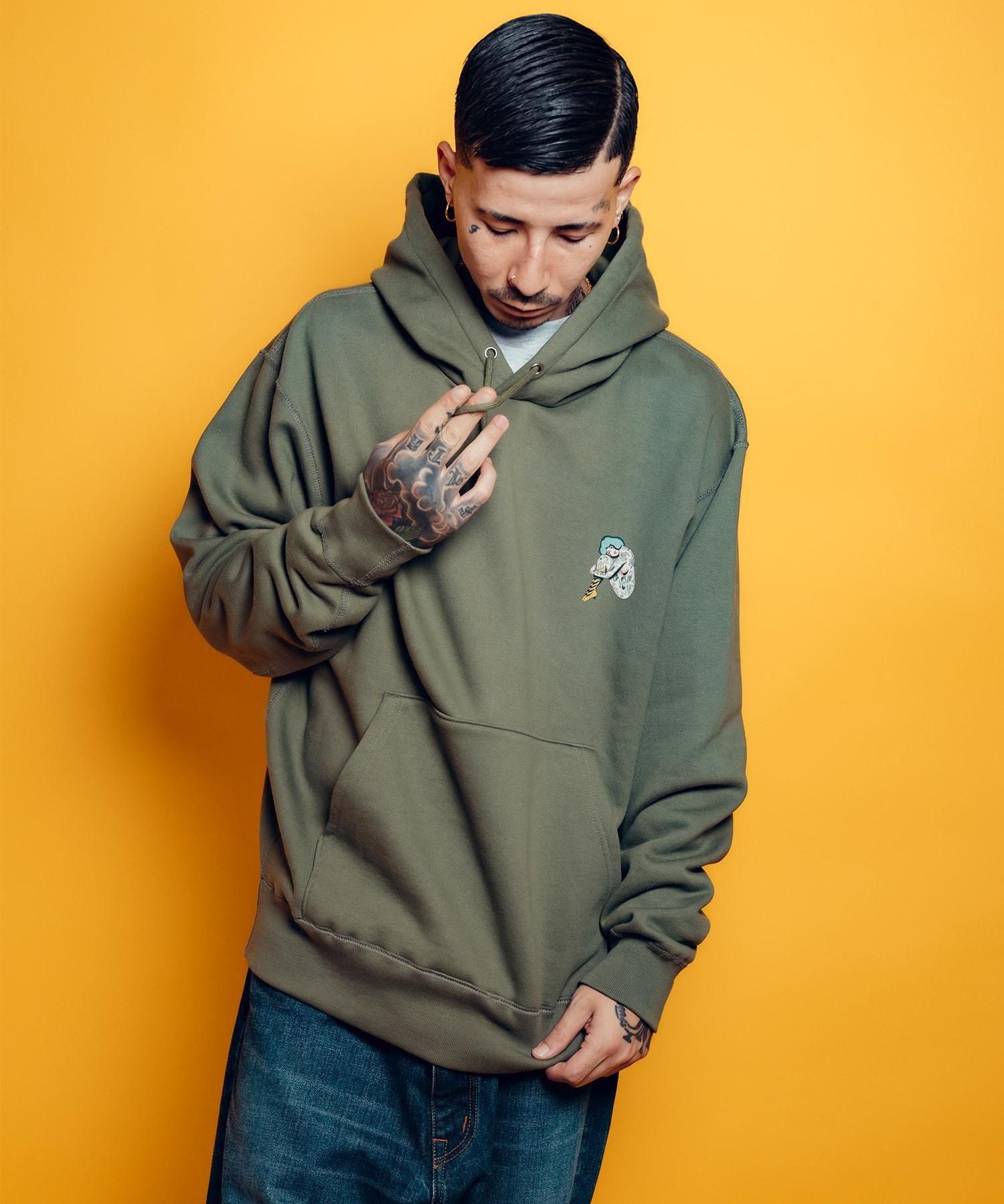 12.4オンスの裏起毛天竺を採用したプルオーバーパーカ。左胸、バックにタトゥーの入った緑髪の少女をピンナップテイストで描いたグラフィックをプリント。ブランドの得意とする世界観が発揮された一着。左裾にはシグネイチャーカラーのスクエアタグを配備。