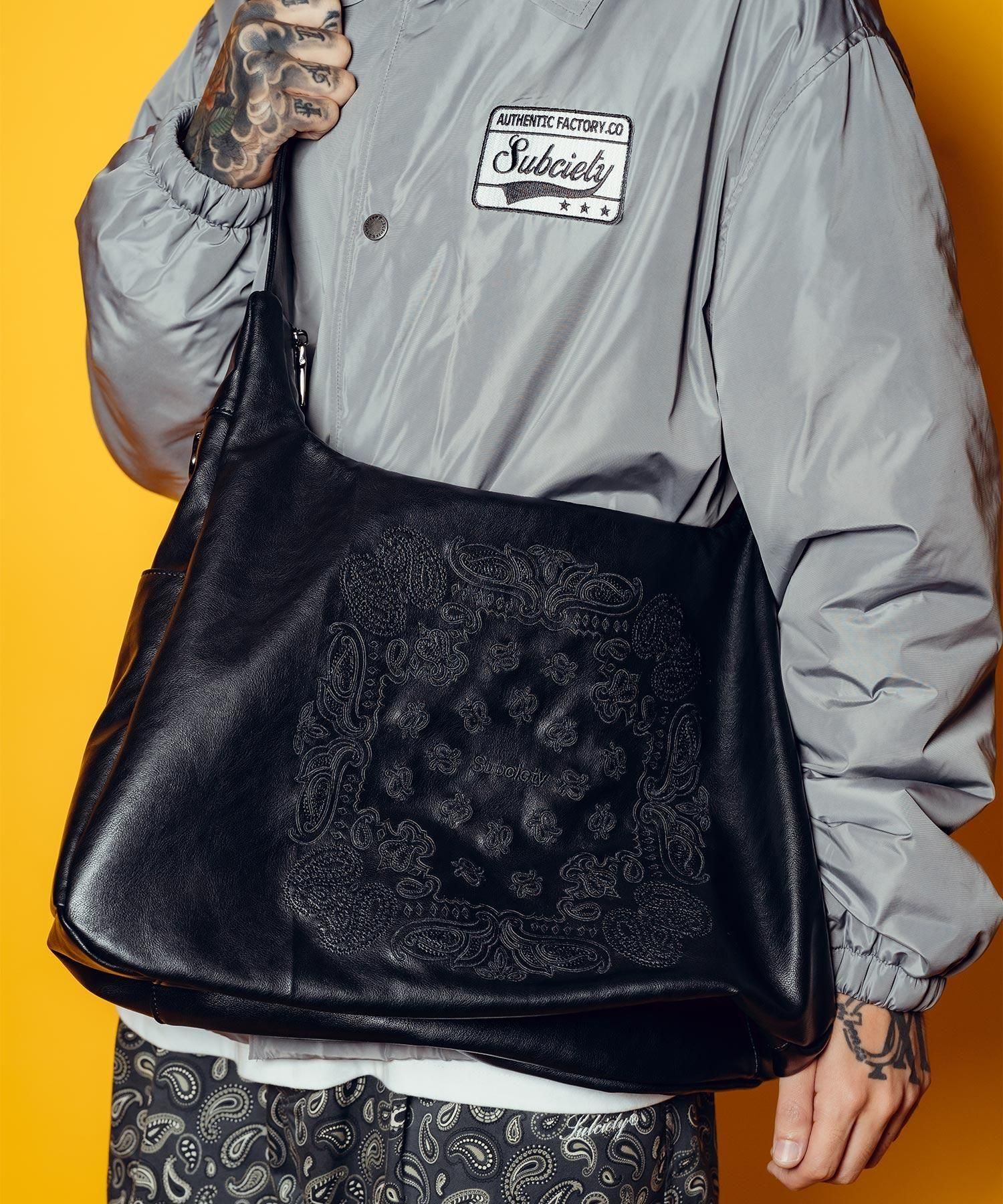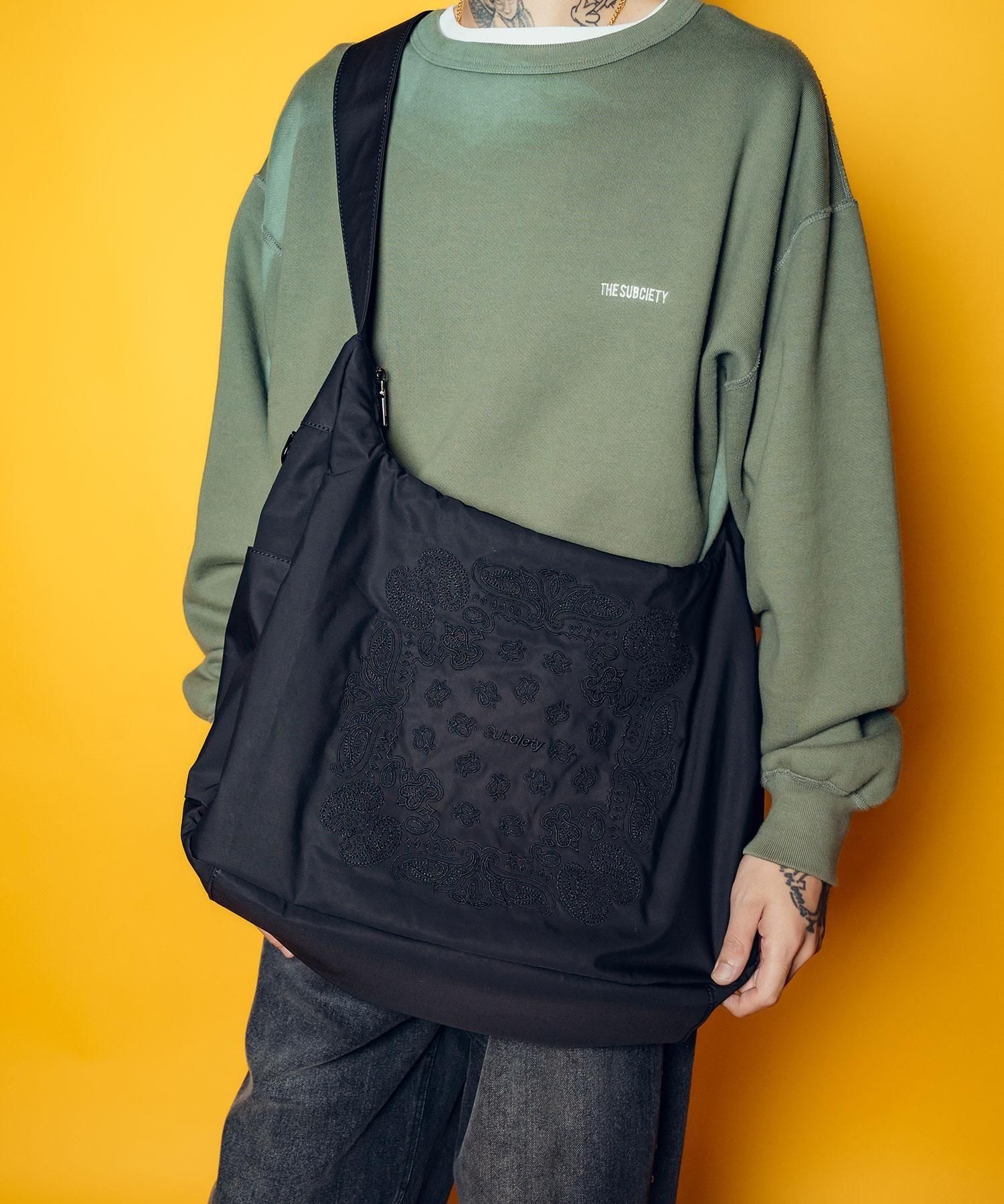 キーホルダーなどの取り付けに最適な金属製Dカンをショルダーストラップ下にオン。バネ式で取り外しが可能。フロントにはブランドを象徴するバンダナパターンを生地同色の刺繍で施しました。