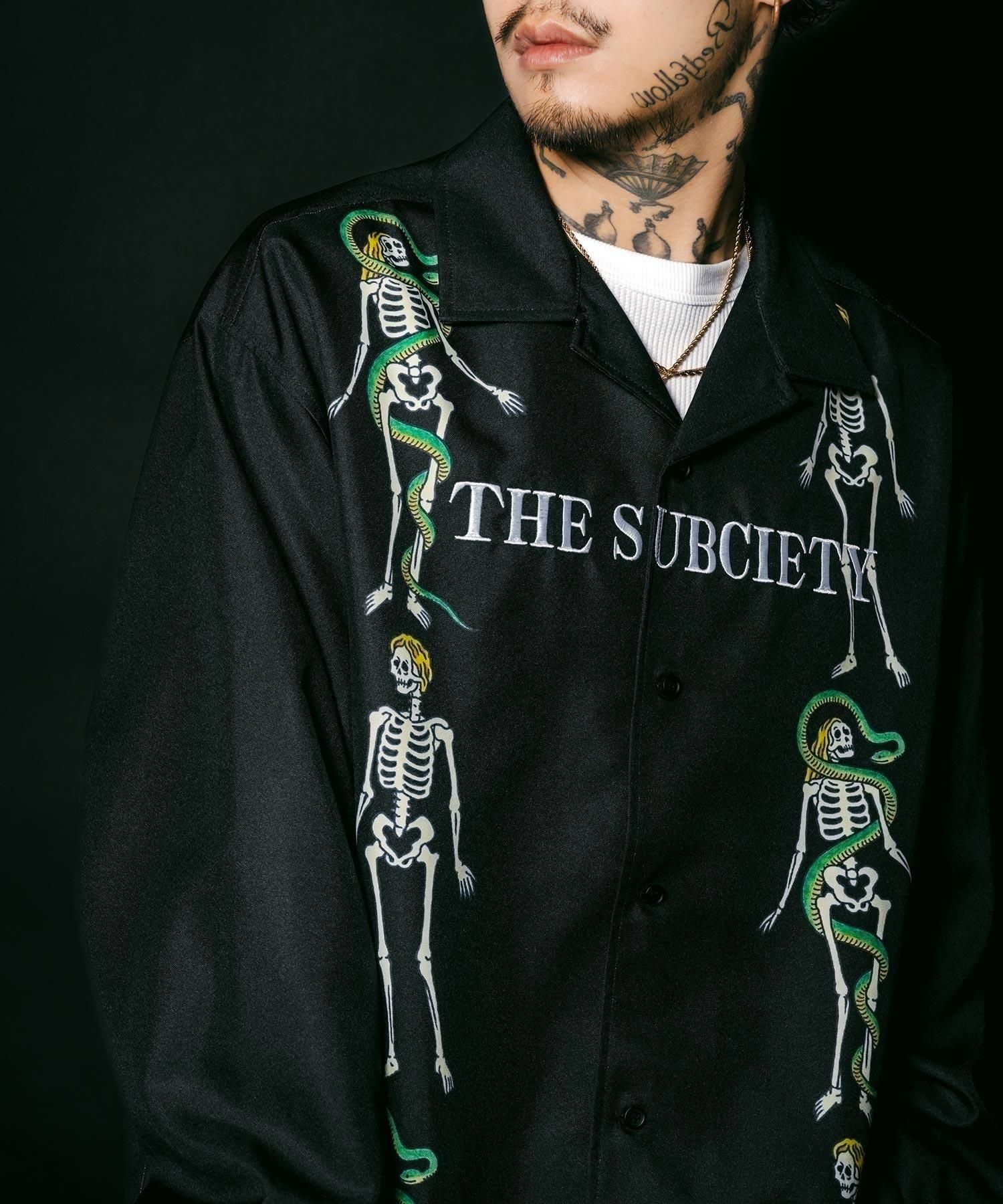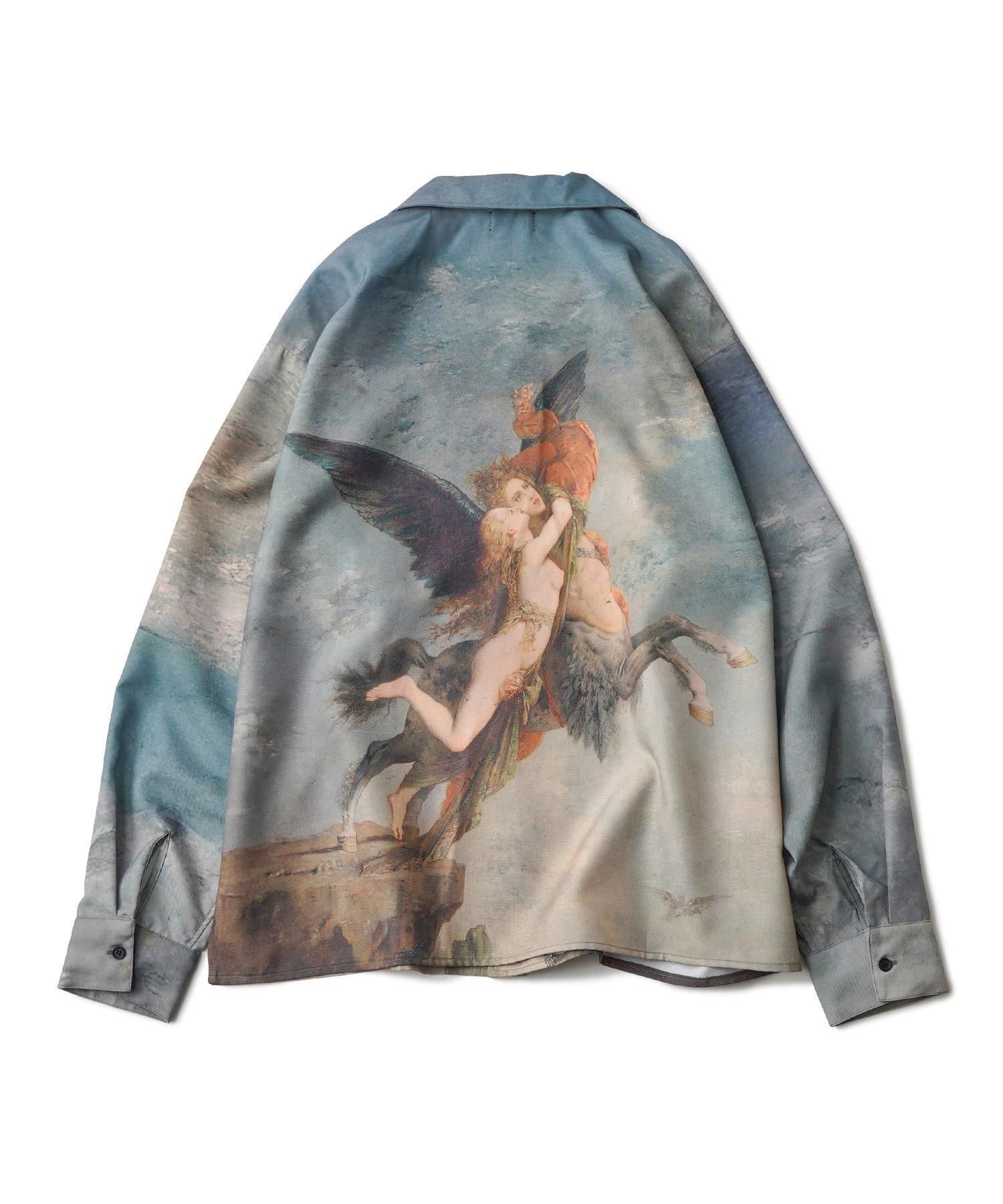 様々なグラフィックを全面にプリントしたオープンカラーシャツ。トラディショナルな開襟シャツのディティールを残しつつ、身幅・アームホールにゆとりを持たせたストレスフリーなシルエット。