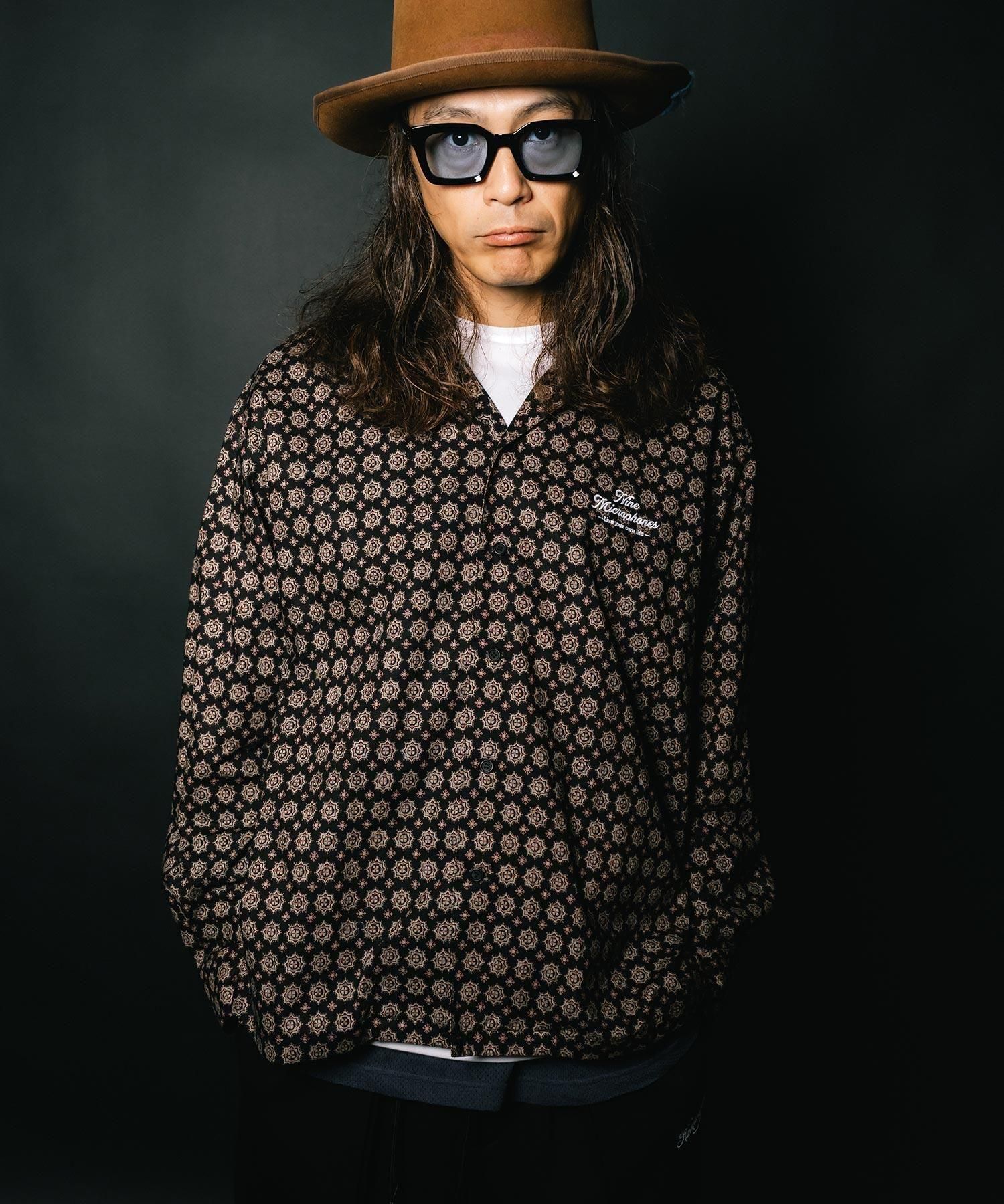 レトロな雰囲気の柄をプリントしたオープンカラーシャツ。